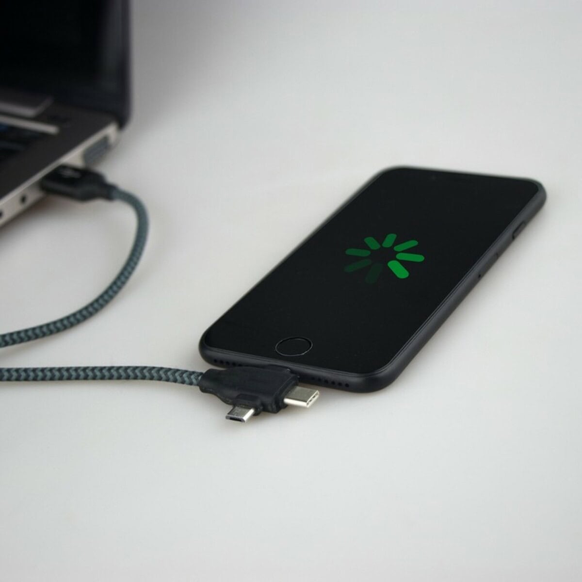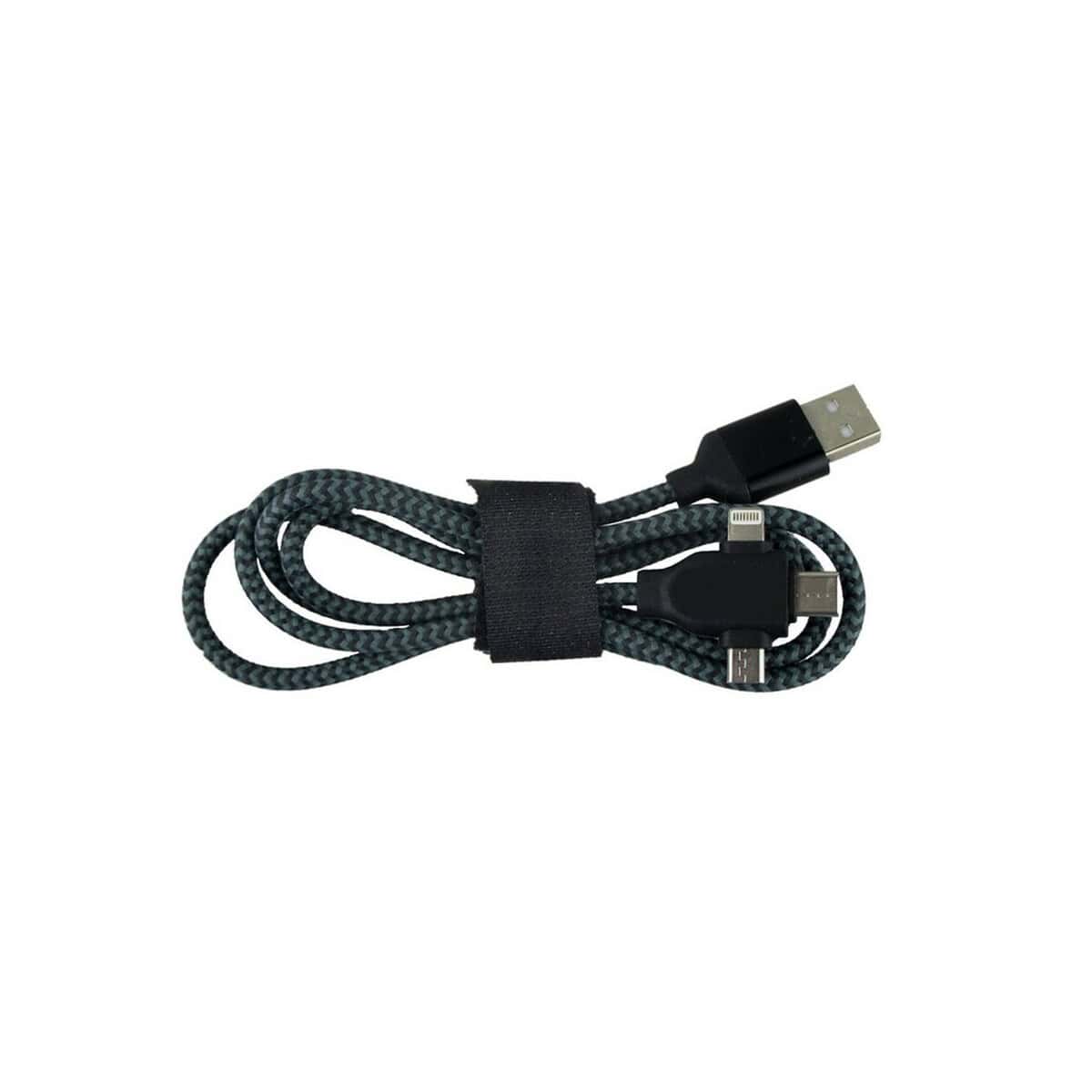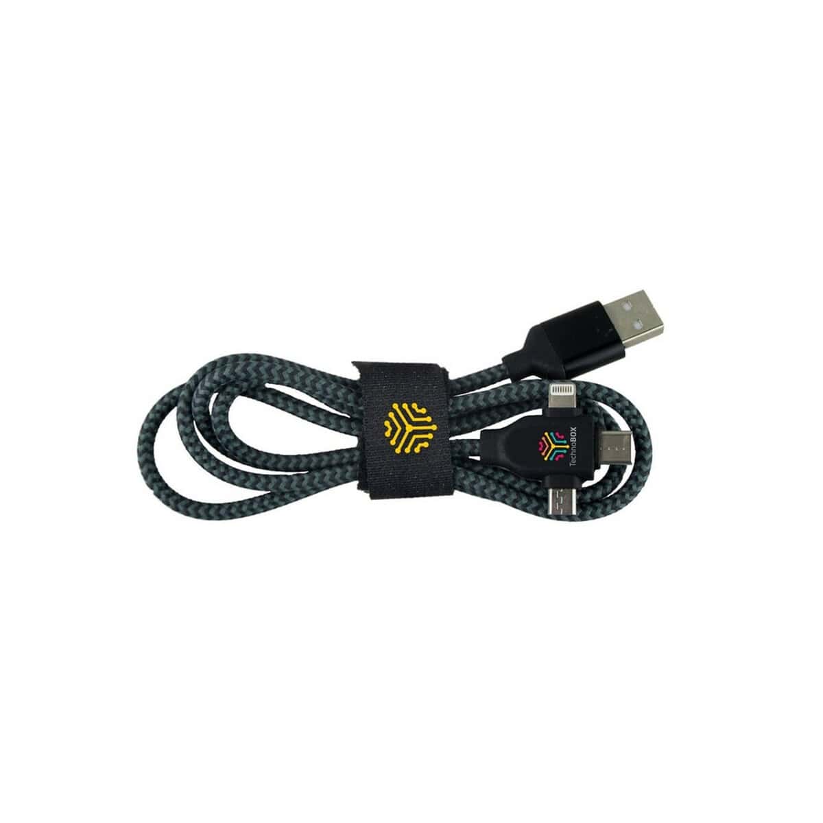 Kabel do ładowania i synchronizacji | Evans to wszechstronny gadżet, który błyskawicznie podbije serca odbiorców w branży technologicznej, e-commerce, edukacyjnej, a nawet fitness 🏋️♂️. Dzięki czterem końcówkom: USB, USB-C, micro USB oraz kompatybilnej z iOS, ten 100-centymetrowy kabel (po złożeniu 12 × 3,5 × 2,5 cm) staje się niezastąpionym towarzyszem zarówno w biurze, jak i w podróży. Lekka waga 33 g, trwałe tworzywo ABS oraz pleciony nylon gwarantują długą żywotność i odporność na codzienne zginanie. Szary kolor pasuje do każdego stylu sprzętu, a sprytny pasek na rzep z miejscem na logo sprawia, że kabel staje się świetną powierzchnią pod nadruk.