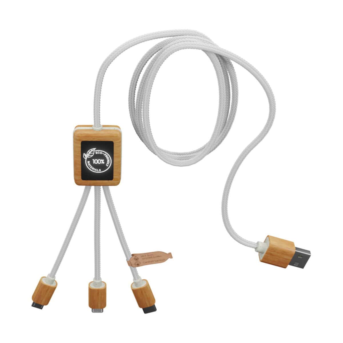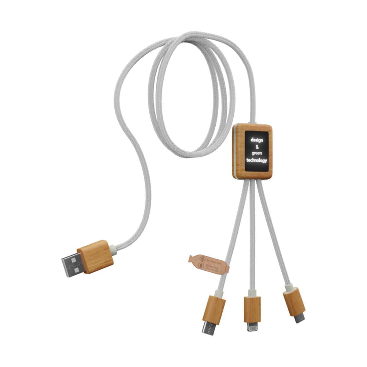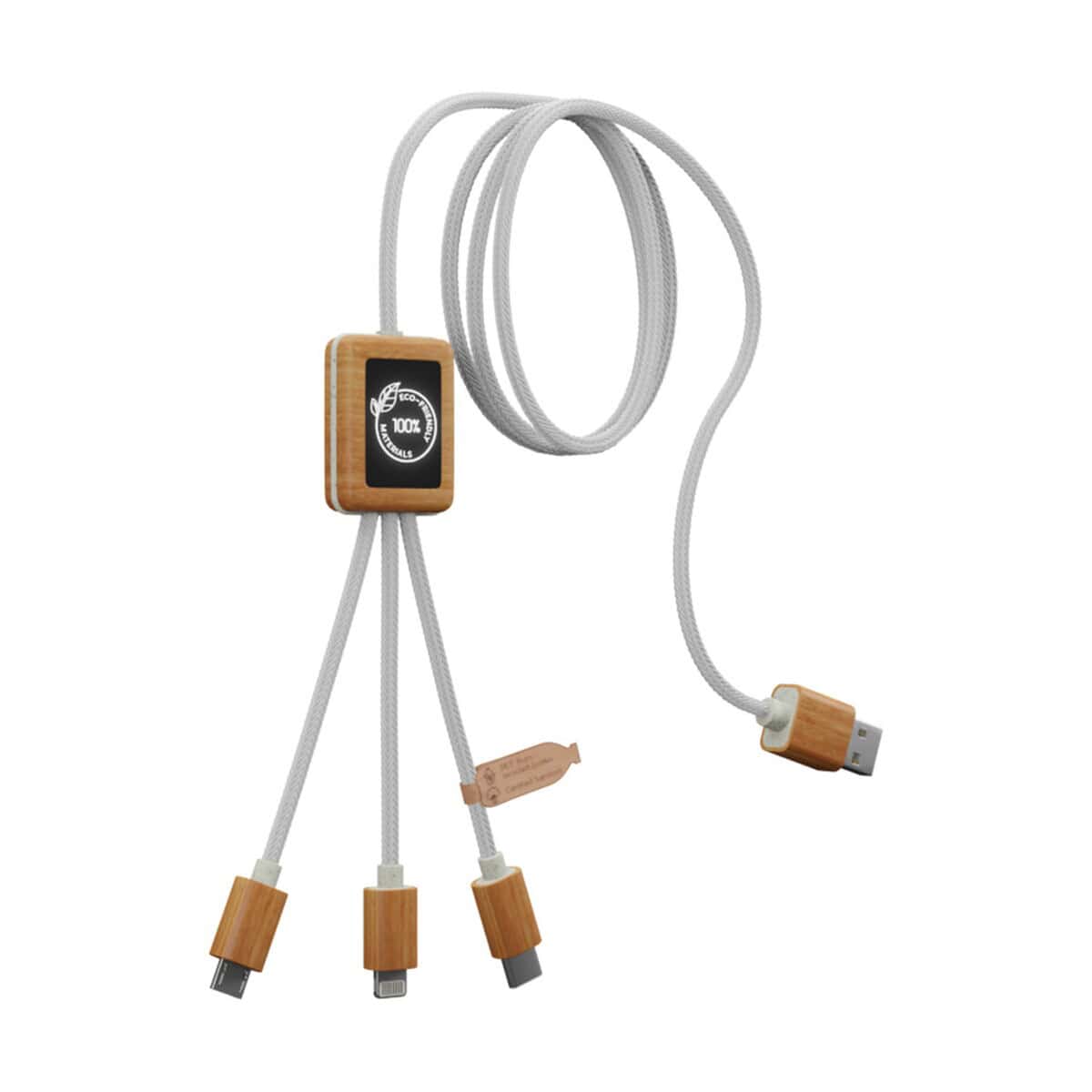 Kabel do ładowania SCX.design C39 z podświetlanym logo 3-w-1 z plastiku PET z recyklingu i z kwadratową drewnianą obudową