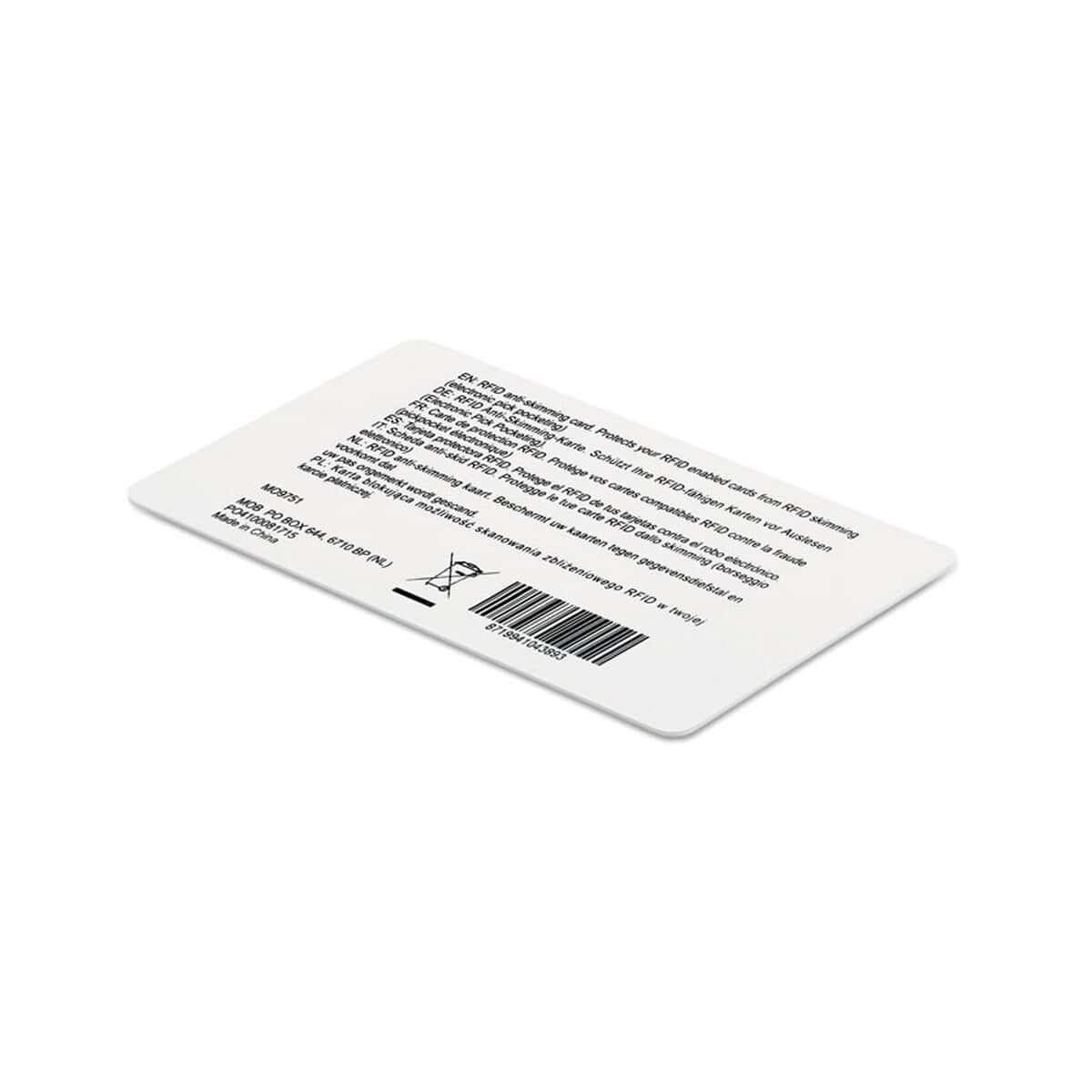 Karta RFID CUSTOS to nowoczesny, a przy tym wyjątkowo praktyczny gadżet, który sprawdzi się zarówno na biurku w biurze, jak i w kieszeni w drodze do klienta 🙂 Dzięki zastosowaniu pola elektromagnetycznego zabezpiecza wszystkie karty 13,56 MHz – miejskie, kolejowe, debetowe czy kredytowe – przed nieautoryzowanym skanowaniem z odległości do 2-3 cm. Ten niepozorny prostokąt o wymiarach 8,5 × 5,5 cm i wadze zaledwie 0,007 kg wykonany został z trwałego materiału: PVC, a elegancki kolor: biały znakomicie eksponuje firmowe logo lub indywidualny nadruk.