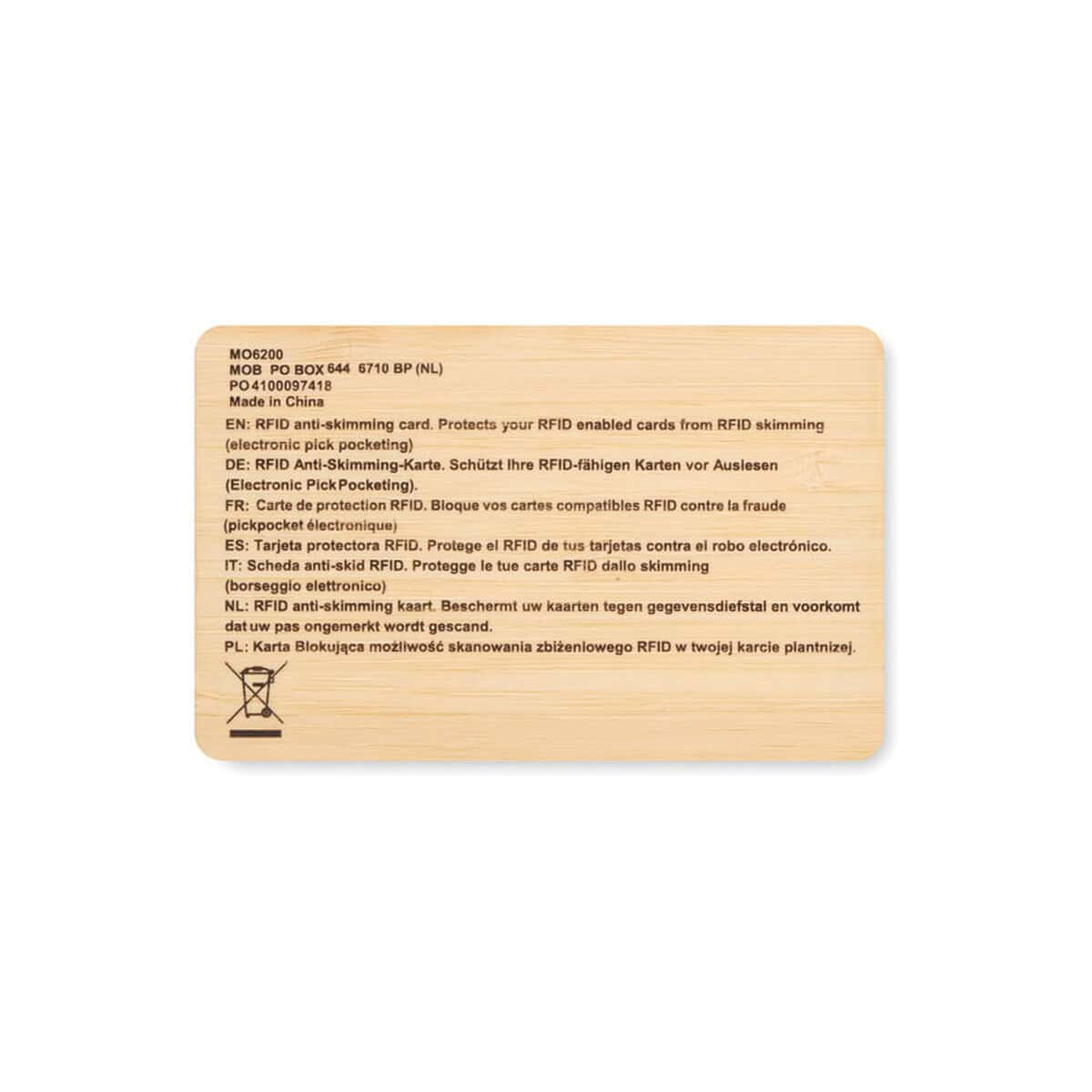 Karta RFID wykonana z bambusa CUSTOS + to nowoczesny, a zarazem ekologiczny gadżet, który zabezpieczy portfel i wizerunek dla Twojej firmy. Wykonana z naturalnego bambusa o wymiarach 8,5 x 5,5 x 0,13 cm i wadze zaledwie 6 g, mieści się w każdym etui czy portfelu, tworząc dyskretną tarczę przeciw skimmingowi 😊. Dzięki technologii RFID anti-skimming blokuje sygnały 13,56 MHz w promieniu 2-3 cm, chroniąc karty płatnicze przed nieautoryzowanym odczytem. Bambusowy charakter sprawia, że każda sztuka jest unikatowa – różnice w barwie i usłojeniu podkreślają naturalne pochodzenie materiału.