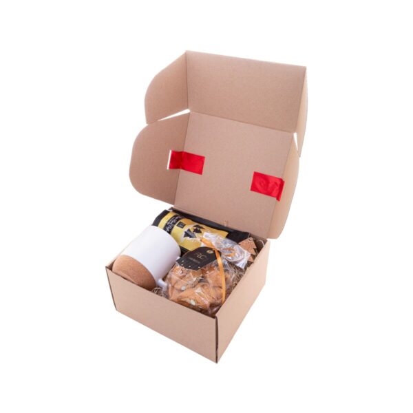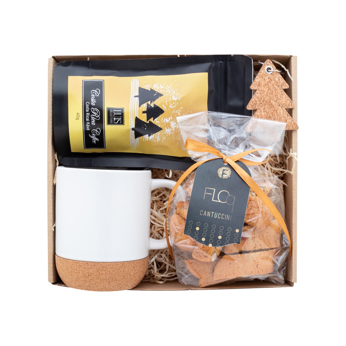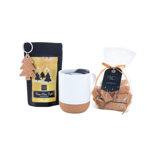Zestaw mieści się w stylowym tekturowym pudełku, którego wnętrze zdobi dekoracyjne wypełnienie z wełny drzewnej. Całość jest ozdobiona czerwoną wstążką, co nadaje paczce wyjątkowego, świątecznego charakteru. W skład Keffik Prezentowy zestaw kawowy wchodzi kubek „Komagu”, który z pewnością zostanie ulubionym naczyniem do picia porannej kawy. Dodatkowo, zestaw zawiera wyselekcjonowaną kawę „Luis” Costa Rica o wadze 40 g, której głęboki aromat i smak przeniosą użytkownika w egzotyczne rejony Ameryki Środkowej. Nie zabrakło także słodkich przysmaków – cantuccini „Floq” (100 g), które doskonale komponują się ze smakiem kawy. Na koniec, uroczy brelok świąteczny „Korkki” dodaje zestawowi osobistego, tematycznego akcentu.