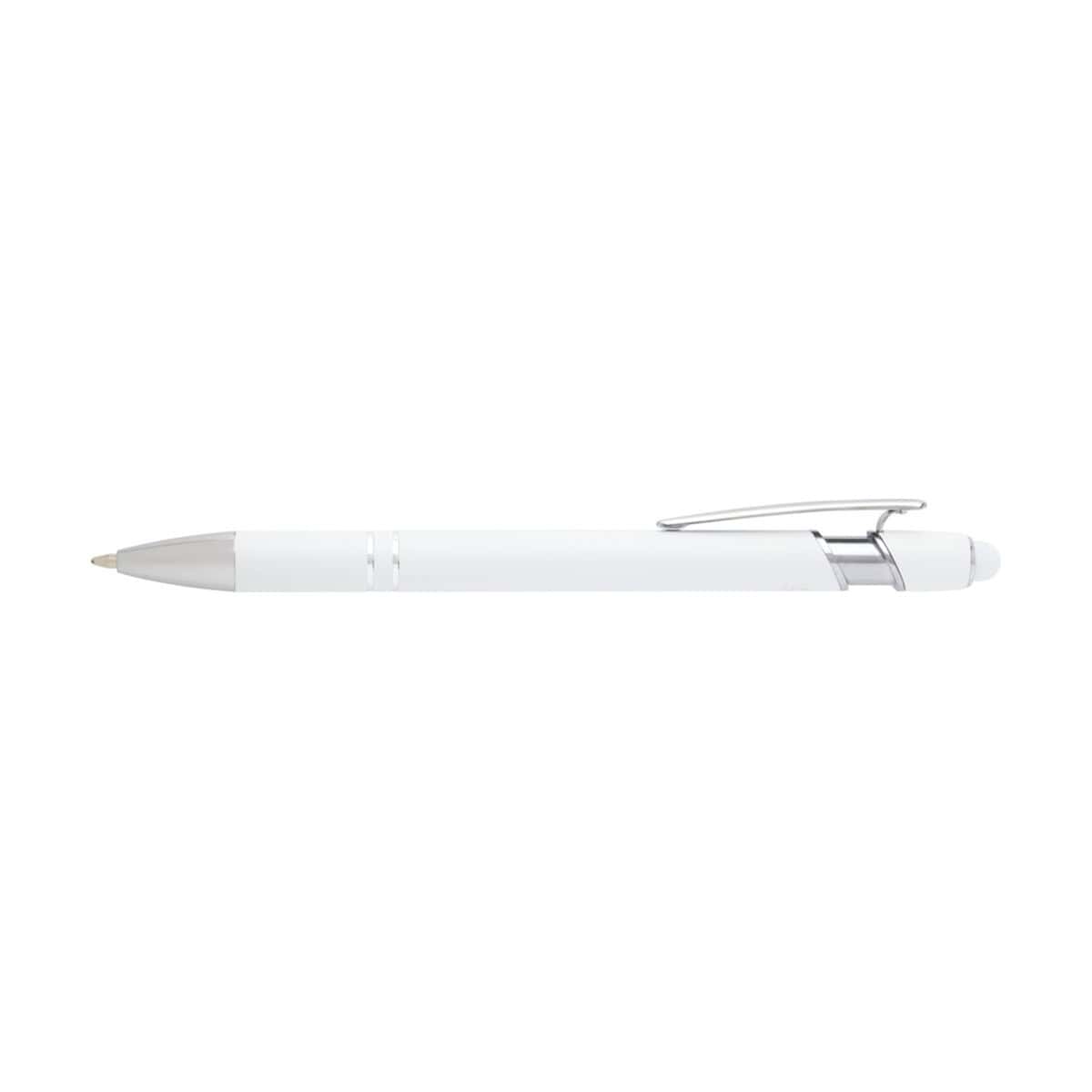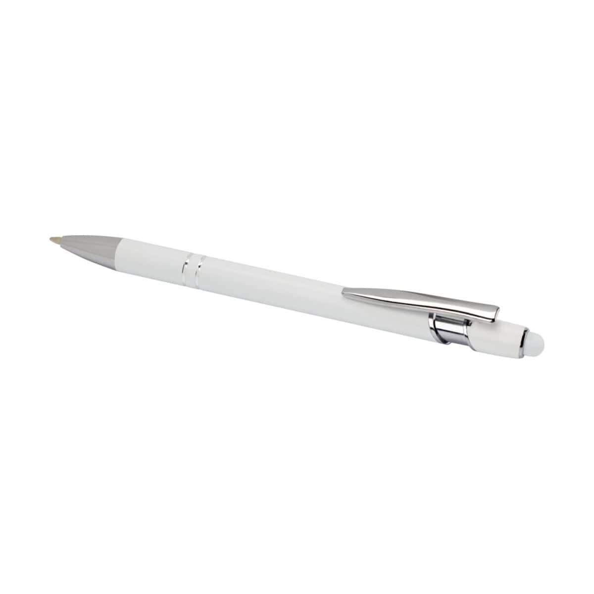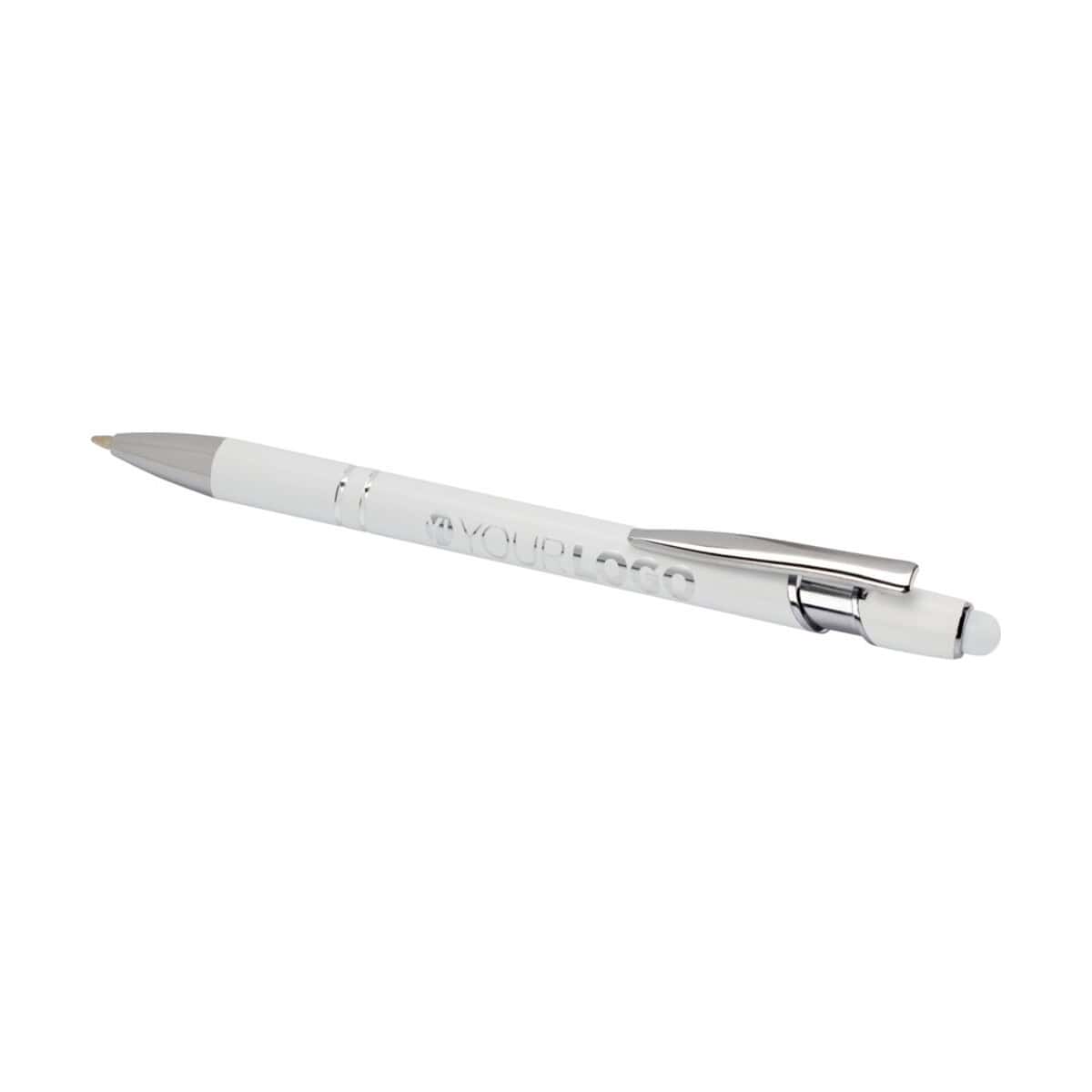 Kish długopis ze srebrnym wykończeniem został wzbogacony o silikonowy rysik dotykowy, dlatego sprawdza się zarówno na papierze, jak i na ekranach smartfonów czy tabletów – to gadżet 2 w 1, którym użytkownicy będą zachwyceni 😊. Na metalowym korpusie doskonale prezentuje się logo naniesione w formie trwałego nadruku lub laserowego grawerunku, co czyni z produktu efektywne narzędzie reklamowe.