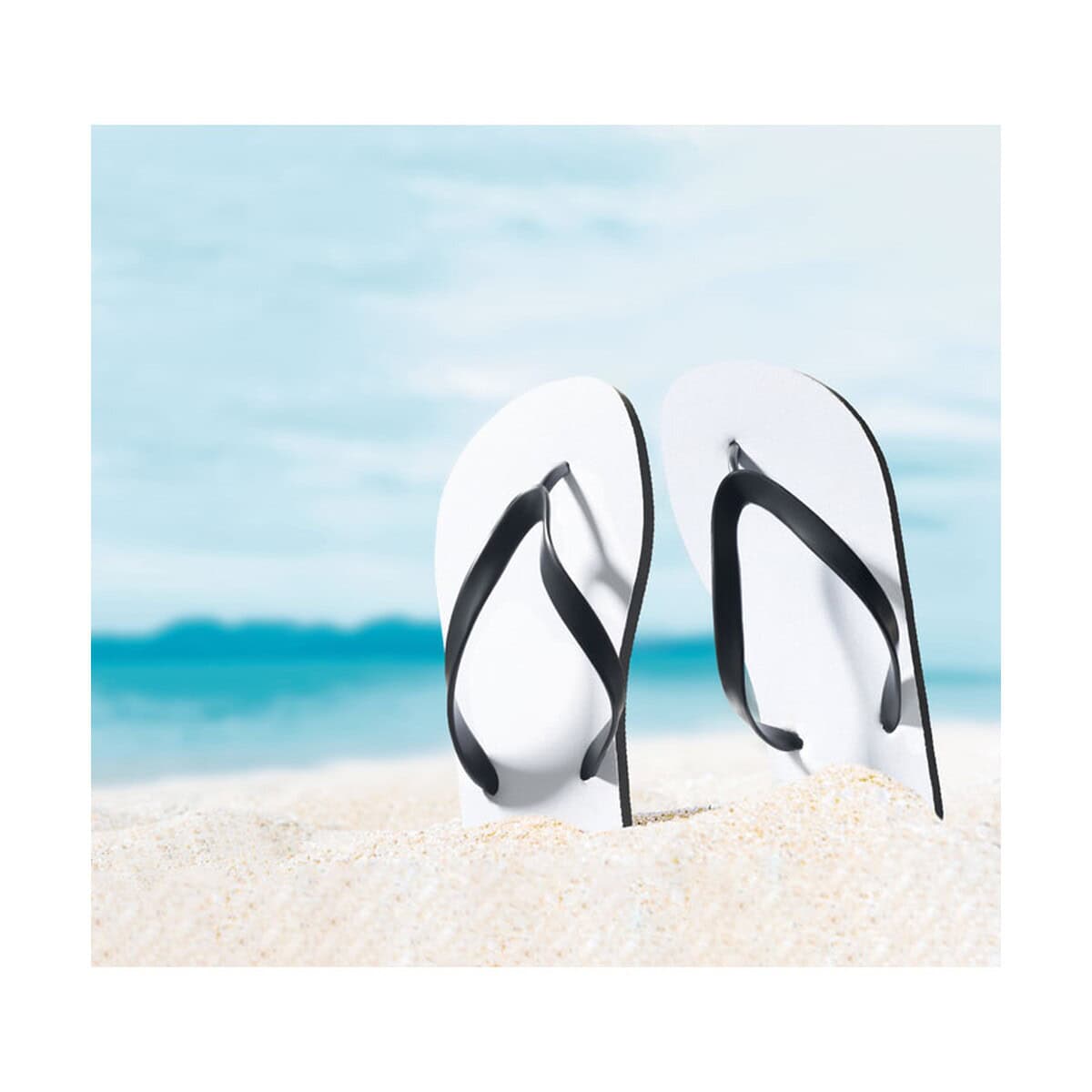 Klapki plaowe do sublimacji DO MEL to prawdziwie uniwersalny gadżet, który zachwyci każdego, kto ceni wygodę i niesztampowe rozwiązania promocyjne. Dzięki możliwości pełnej personalizacji metodą sublimacji, stają się perfekcyjną powierzchnią na Twoje logo albo barwny nadruk. Pasek z PVC jest miękki, a jednocześnie solidny, co gwarantuje komfort chodzenia zarówno na plaży, jak i w hotelowym spa. Do tego czarna, gumowa podeszwa o wymiarach 34 × 27,5 × 1,2 cm oraz wierzchnia tkanina poliestrowa sprawiają, że klapki są nie tylko stylowe, lecz także trwałe. ⚡