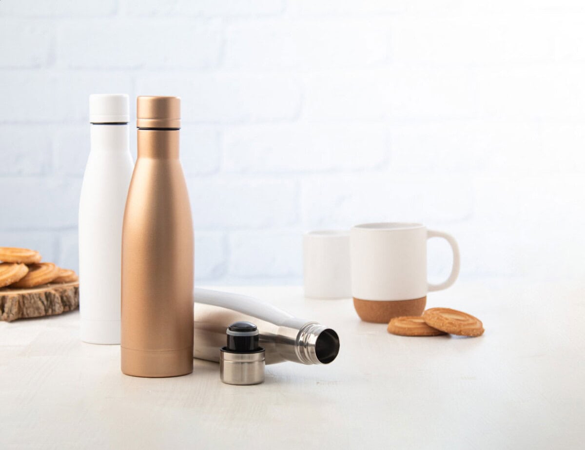 Koppar butelka izolowana miedzią to znakomity sposób, by podkreślić charakter marki i zadbać o planetę jednocześnie. Jej podwójne ścianki ze stali nierdzewnej oraz izolacja miedziana pozwalają cieszyć się gorącą kawą aż 12 h, a orzeźwiającą wodą nawet 24 h. Dzięki pojemności 500 ml i smukłym wymiarom ø70×263 mm naczynie mieści się w większości uchwytów samochodowych, plecaków czy toreb sportowych. Waży jedynie 283 g, więc jest lekkie niczym piórko 🙂