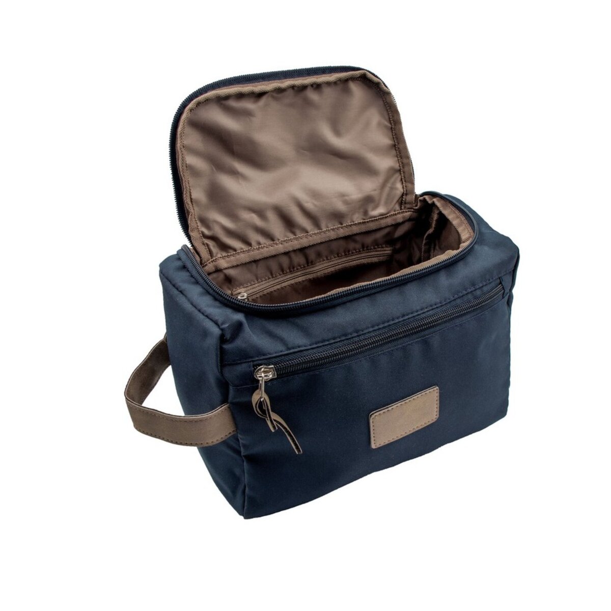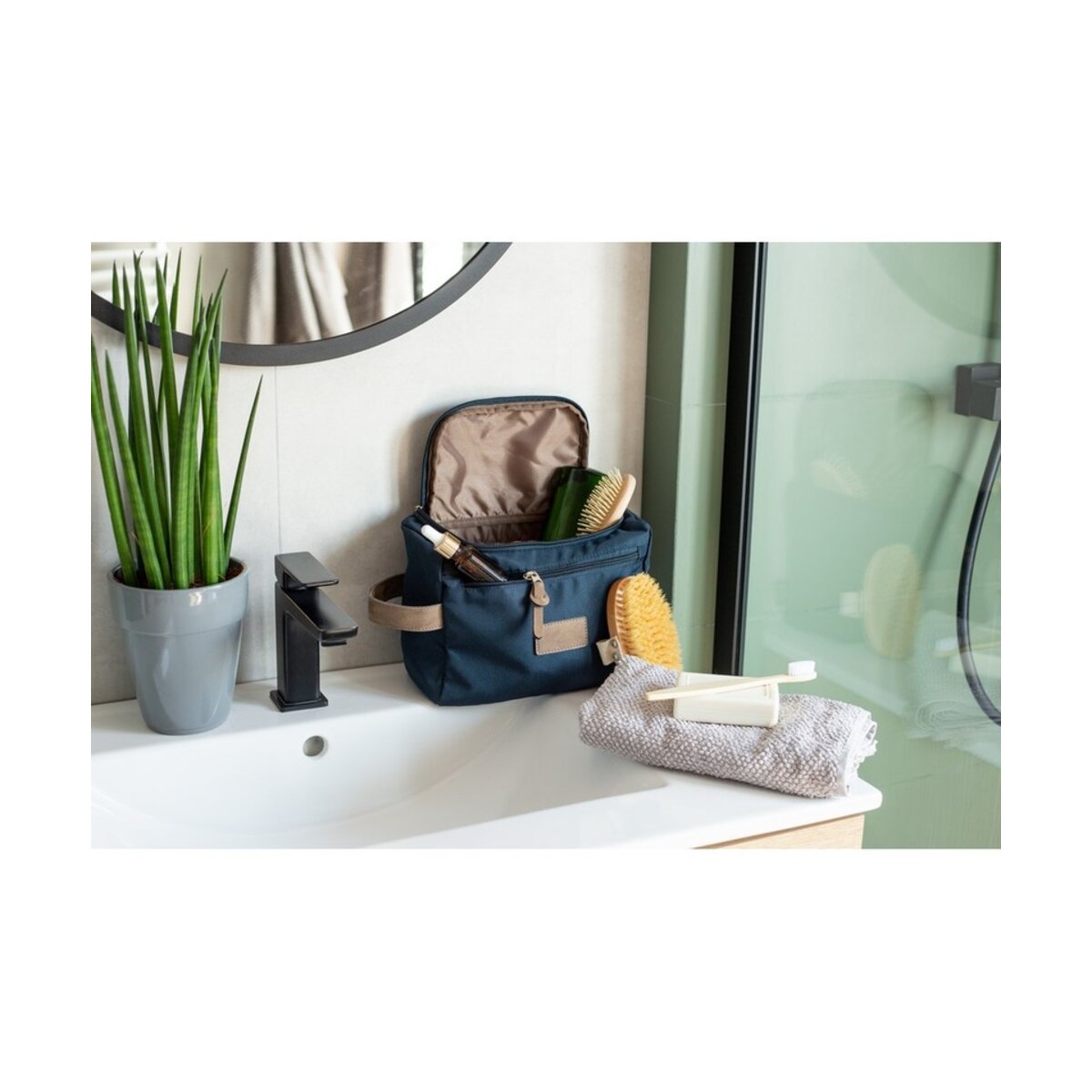 Kolor ciemnoniebieski dodaje elegancji, a wytrzymały materiał gwarantuje długotrwałe użytkowanie. Wyposażona w przegrodę główną oraz dodatkową przednią kieszeń na zamek błyskawiczny, pozwala na organizację i bezpieczne przechowywanie Twoich kosmetyków i drobiazgów. Wewnętrzna kieszeń zapinana na zamek to idealne miejsce na cenne przedmioty. Wymiary 23 x 18 x 11 cm oraz waga jedynie 115 g czynią z tej kosmetyczki kompaktowego i lekkiego towarzysza podróży.