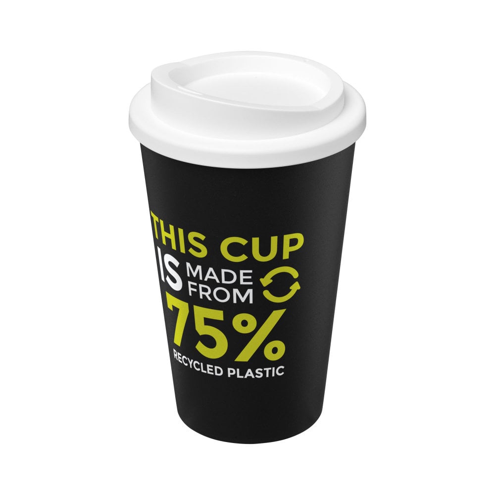 Ten dwuwarstwowy, izolowany kubek z zakręcaną pokrywą to doskonały wybór dla osób ceniących sobie wysoką jakość i estetykę. Wykonany jest w 100% z polipropylenu z recyklingu, a pokrywka z polipropylenu klasy spożywczej, dostępna w szerokiej gamie kolorów. Odcień czerni na kubku może się różnić w zależności od rodzaju użytego materiału z recyklingu. Pojemność 350 ml. Wyprodukowano w Wielkiej Brytanii i zapakowano w torbę, którą można kompostować w domu.