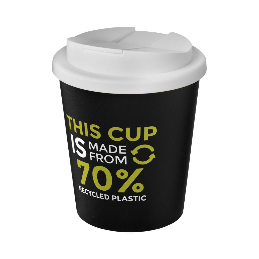Dwuwarstwowy, izolowany kubek ze szczelną, zatrzaskową pokrywą, która zapobiega rozlanom, stworzony został z 100% polipropylenu z recyklingu. Pokrywka wykonana została bez użycia silikonu, dzięki czemu kubek jest w pełni przystosowany do recyklingu. Charakteryzuje się pojemnością 250 ml i dostarczany jest w torbie, którą można kompostować w domu. Wyprodukowano go w Wielkiej Brytanii.