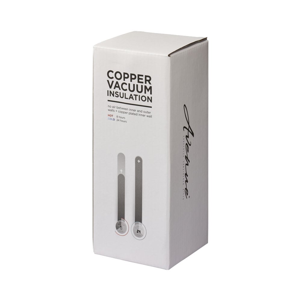 Kubek Avenue to wytrzymała i funkcjonalna propozycja wyposażenia każdego domu lub biura. Jego kompaktowy rozmiar sprawia, że doskonale mieści się on w większości uchwytów, a szczelne wieczko z otwieraniem typu „flip-top” zapewnia łatwy dostęp do napoju. Co więcej, kubek jest wyposażony w konstrukcję próżniową z podwójnymi ściankami i miedzianą izolacją, które utrzymują jego temperaturę przez odpowiednio 8 i 24 godzin. Do tego wszystkiego kubek Avenue posiada pojemność 500 ml oraz zapakowany jest w estetyczne pudełko prezentowe.