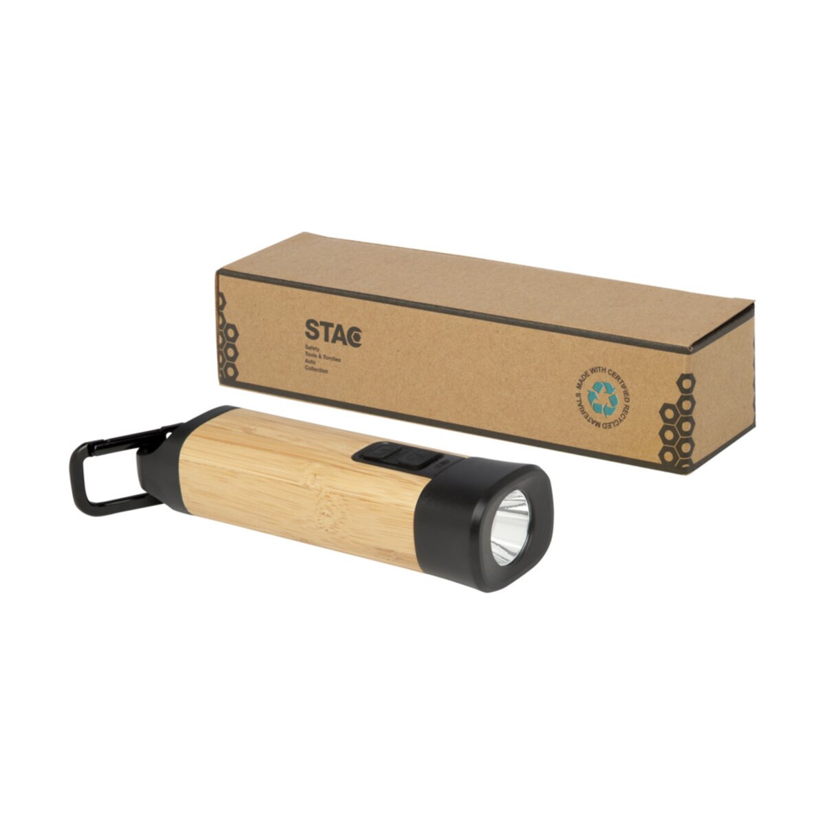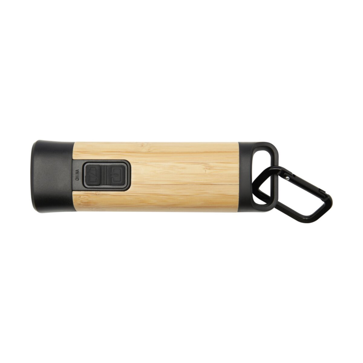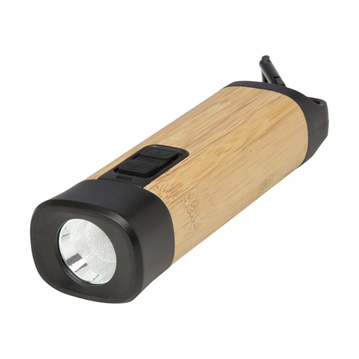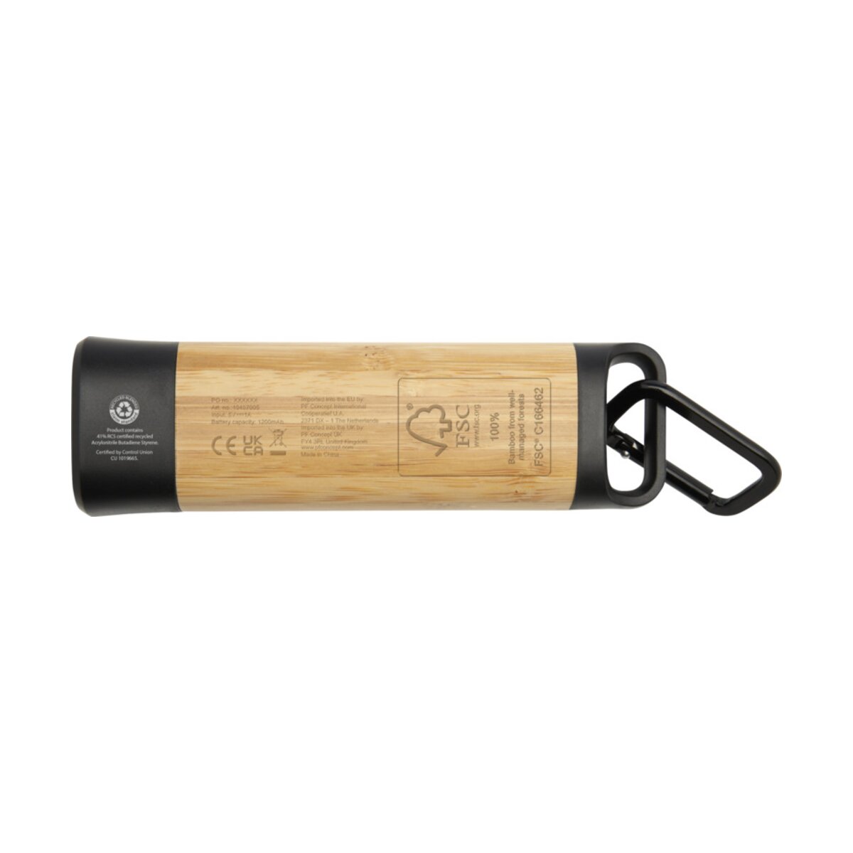 Kuma latarka z karabińczykiem wykonana z certyfikowanego bambusa i w 41% z tworzyw sztucznych pochodzących z recyklingu z certyfikatem RCS, co czyni ją bardziej przyjaznym dla środowiska wyborem podczas wycieczek krajoznawczych, majsterkowania lub poruszania się w przypadku przerw w dostawie prądu. Wyposażona w mocne źródło światła COB o mocy 3 W, dostępne w 3 różnych trybach świecenia, Kuma wytwarza 80 lumenów światła przy zasięgu wiązki do 100 metrów po pełnym naładowaniu. Latarka wyposażona w akumulator litowo-jonowy 18650 o dużej pojemności 1200 mAh zapewnia trwałość i niezawodność oraz 3,5–4,5 godzin ciągłego świecenia na jednym ładowaniu. Dołączony aluminiowy karabińczyk umożliwia łatwe przymocowanie do plecaków, pasków lub sprzętu, czyniąc latarkę niezawodnym towarzyszem podczas biwakowania lub wędrówek. Ponieważ bambus jest produktem naturalnym, mogą występować niewielkie różnice w kolorze i rozmiarze, które mogą mieć wpływ na ostateczny wygląd nadruku. Dostarczana z kablem ładującym TPE typu C o długości 30 cm i pakowana w pudełko upominkowe STAC pochodzące ze zrównoważonych źródeł.