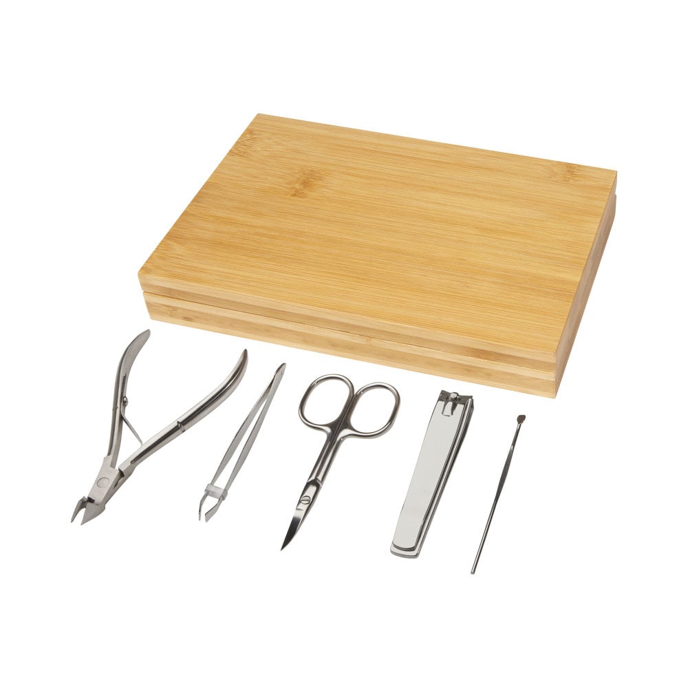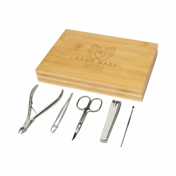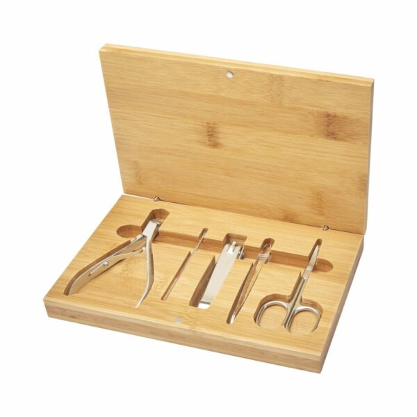 Ten wysokiej jakości i pięknie wykonany zestaw do manicure z bambusa będzie doskonałym dodatkiem do Twojego domowego salonu piękności. W skład zestawu wchodzą szczypce do skórek (10,3 x 4,3 x 1 cm), dłubaczka do uszu (8 cm), obcinaczka do paznokci u nóg i palców (8 x 1,5 x 1,5 cm), pęseta (8,5 x 0,7 cm) i nożyczki (9,5 x 4,2 cm). Bambus, z którego wykonane są narzędzia, jest pozyskiwany i produkowany zgodnie z normami zrównoważonego rozwoju, dzięki czemu możesz być pewny, że korzystasz z produktu najwyższej jakości.