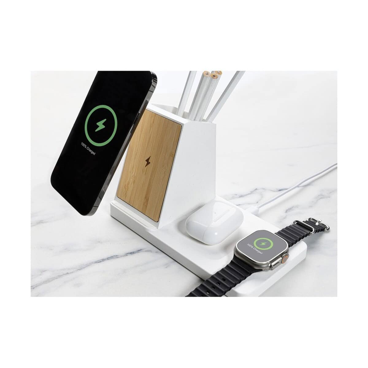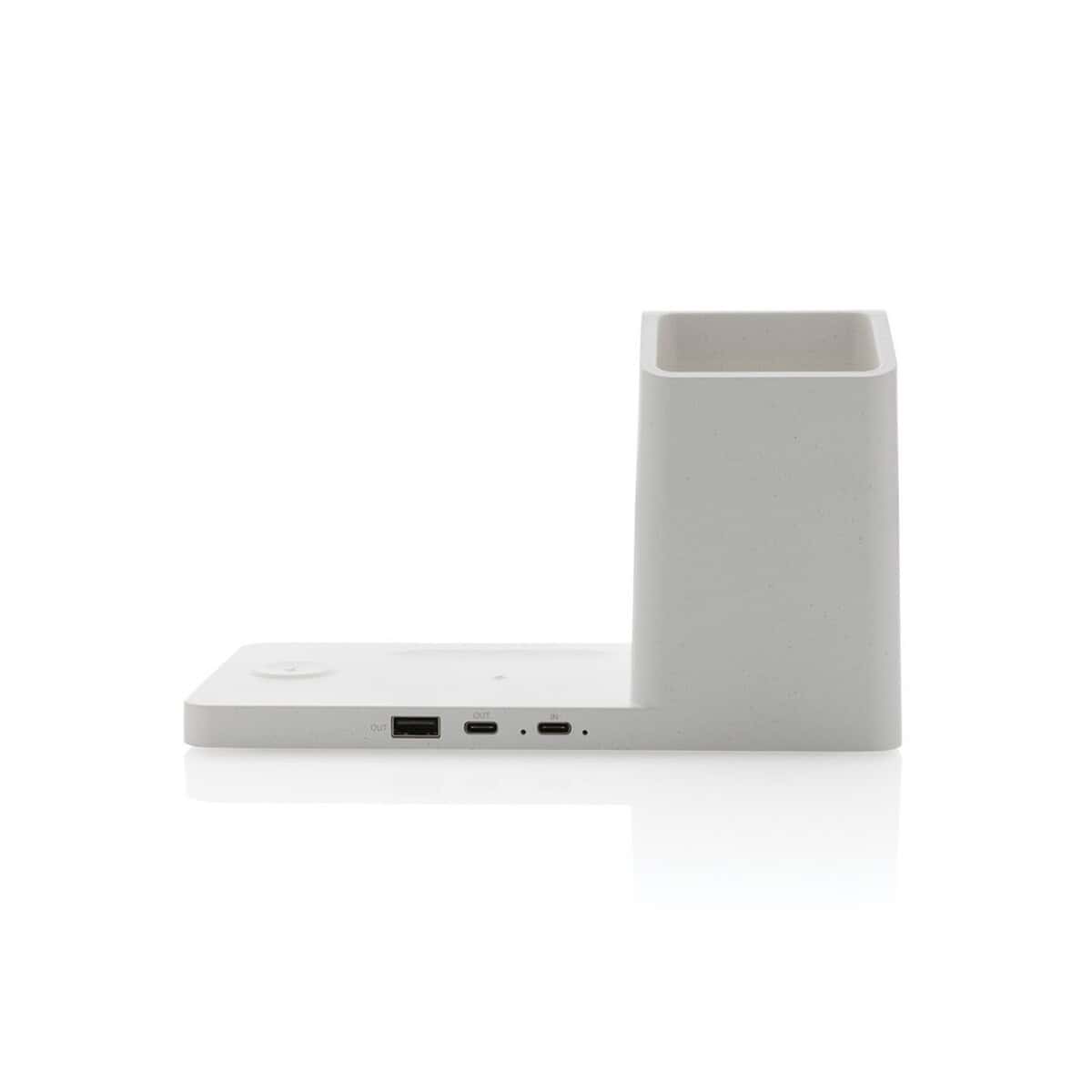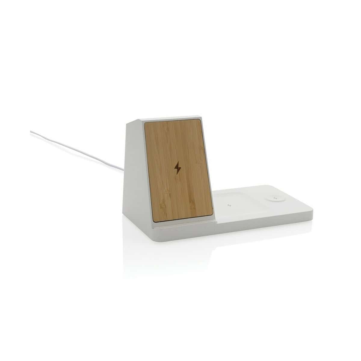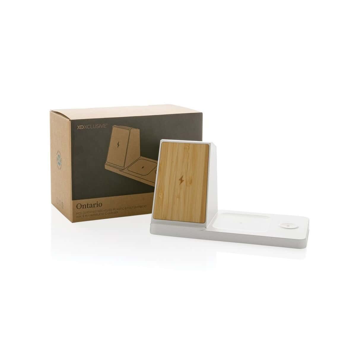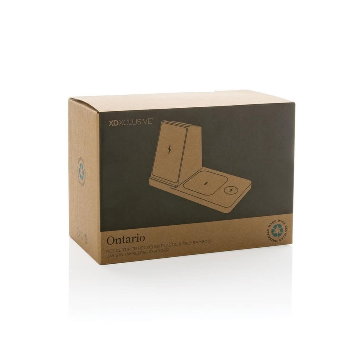 Ładowarka bezprzewodowa 3 w 1 15W Ontario, plastik z recykignu to znakomity gadżet technologiczny, który łączy ekologię z najnowszą funkcjonalnością. Wykonana z ABS z recyklingu (aż 73 % wagowej zawartości materiałów odzyskanych) oraz eleganckiego bambusa FSC®, doskonale prezentuje się z każdym logo. Dzięki mocy 15 W błyskawicznie naładuje smartfon wyposażony w indukcję, równocześnie oferując 5 W dla słuchawek bezprzewodowych i 2,5 W dla zegarka. Dodatkowe porty USB i USB-C pozwalają zasilić kolejne urządzenia przewodowo – wszystko w jednym, kompaktowym formacie 20 × 10,4 × 11,8 cm ⚡.