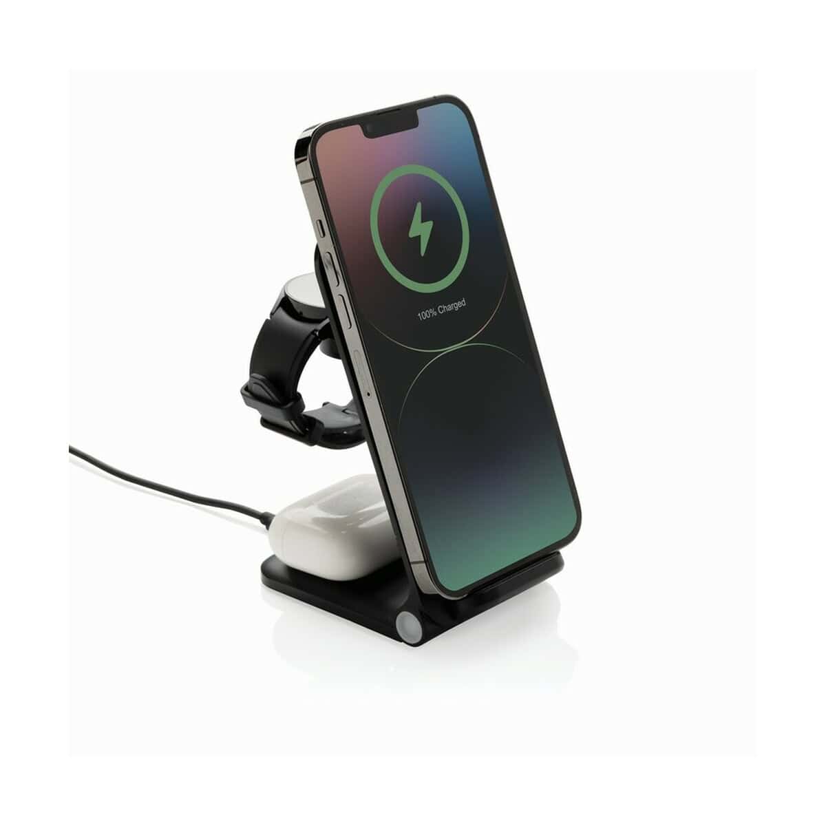 Ładowarka bezprzewodowa 3 w 1, 15W Powerpal to nowoczesny, ekologiczny i niezwykle funkcjonalny gadżet, który wyniesie komfort codziennego ładowania na całkiem nowy poziom. Wykonana z wysokiej jakości ABS oraz aluminium z recyklingu, posiada certyfikaty RCS i FSC®, dzięki czemu doskonale wpisuje się w prośrodowiskowe trendy. Zintegrowana ładowarka o mocy 15W szybko zasili smartfon, a dodatkowe moduły 5W i 2,5W pozwolą jednocześnie ładować słuchawki douszne oraz smartwatch Apple. Urządzenie jest w pełni składane, ma kompaktowe wymiary 15,6 × 7,3 × 2,3 cm i jest w 100% wolne od PVC – to wyśmienity wybór dla osób ceniących mobilność i zdrowe środowisko 🙂.