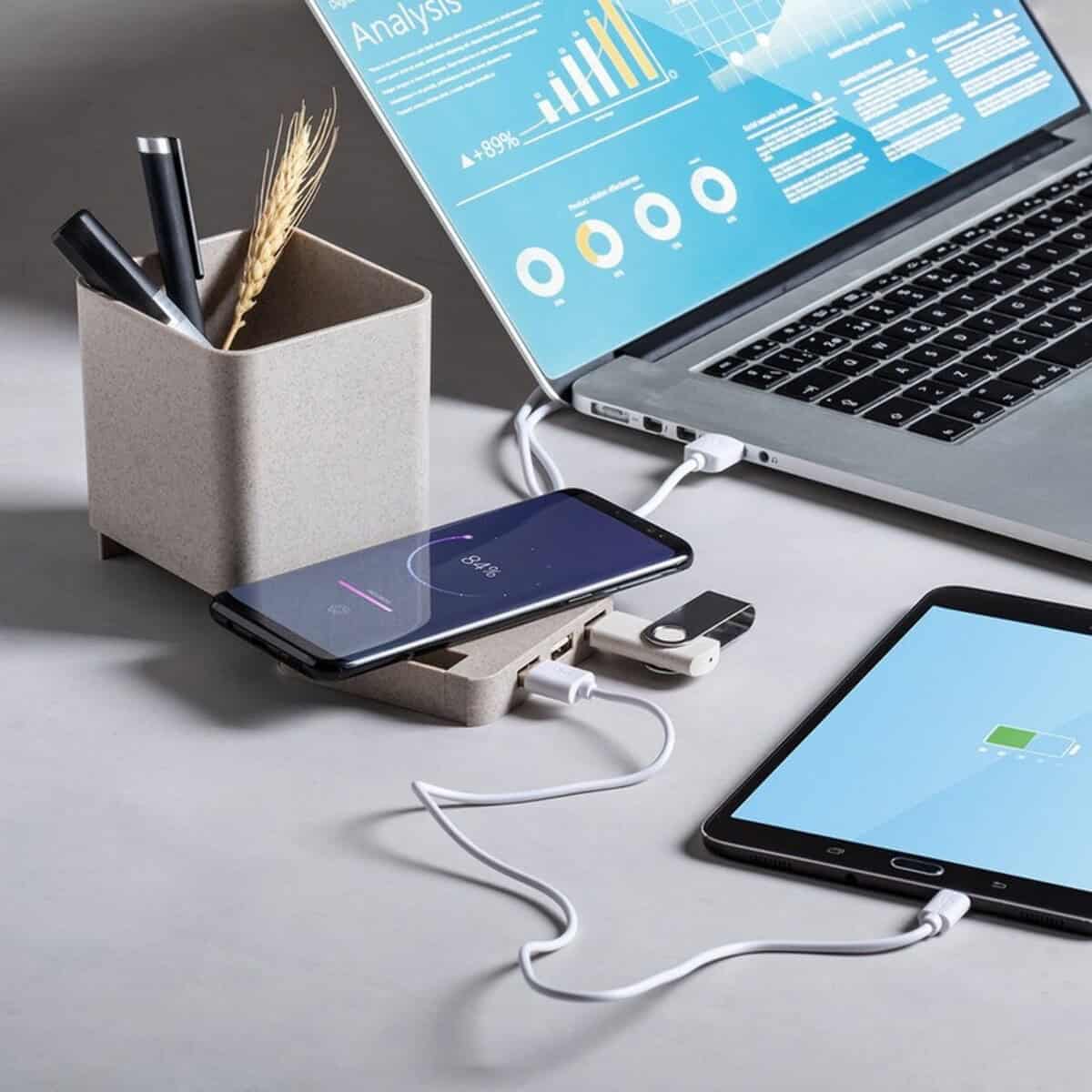 Ładowarka bezprzewodowa 5W ze słomy pszenicznej, hub USB 2.0, pojemnik na przybory do pisania, stojak na telefon jest doskonała dla studentów, grafików, konsultantów czy managerów prowadzących prezentacje. Ułatwia prowadzenie wideokonferencji, ładuje sprzęt bez kabli, poszerza liczbę dostępnych portów i porządkuje biurko. Można ją też wykorzystać w recepcjach hoteli, salonach sprzedaży lub strefach relaksu, gdzie pełni jednocześnie rolę funkcjonalnego stojaka informacyjnego i punktu zasilania.
