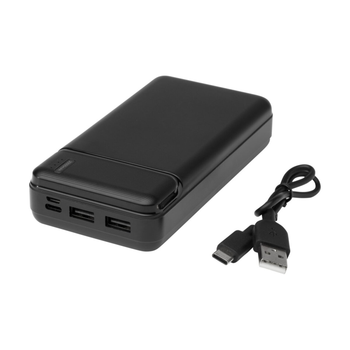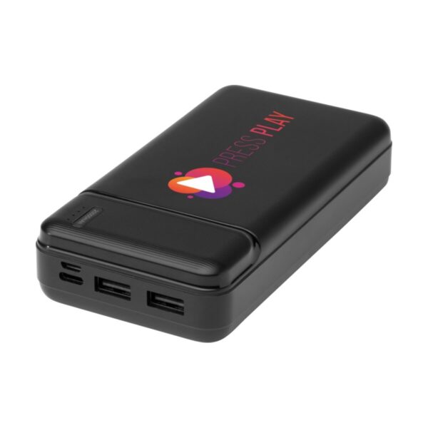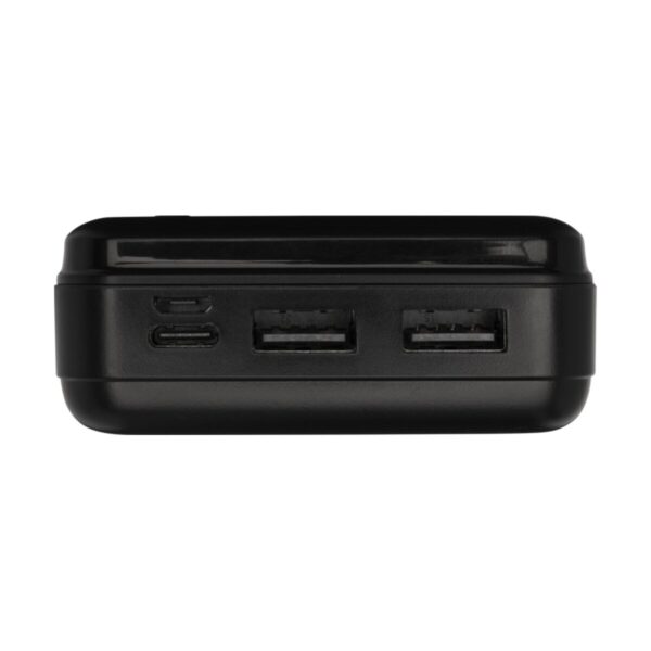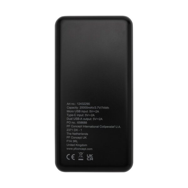Powerbank wykonany z plastiku ABS pochodzącego z recyklingu. Power bank zawiera wytrzymałą baterię litowo-polimerową klasy A o pojemności 20 000 mAh, która zapewnia szybkie ładowanie. Wskaźniki zasilania wskazują pozostały poziom energii, dzięki czemu zawsze wiesz, kiedy należy naładować urządzenie. Wejście typu C 5 V/2 A, wejście Micro USB 5 V/2 A, podwójne wyjście USB-A 5 V/2 A, całkowita moc 10 W. Dostarczany z 30-centymetrowym kablem ładującym TPE 2A USB-A do USB typu C, instrukcją obsługi i pudełkiem upominkowym z papieru Kraft.