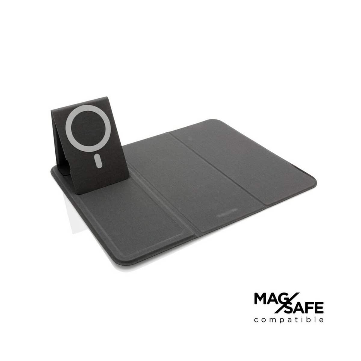 Nie jest to jednak zwykła ładowarka – innowacyjna konstrukcja łączy składany stojak na telefon ze stylową podkładką pod mysz, co czyni ją doskonałym narzędziem do pracy hybrydowej. Poręczne wymiary 10,1 × 1,5 × 23,6 cm i lekka, lecz trwała mieszanka poliuretanu oraz kartonu sprawiają, że produkt z łatwością mieści się w torbie czy plecaku. Jego uniwersalny, czarny kolor podkreśla profesjonalny charakter, a zastrzeżony wzór i niski ślad węglowy 1,91 kg CO₂ to atut dla firm dbających o środowisko.