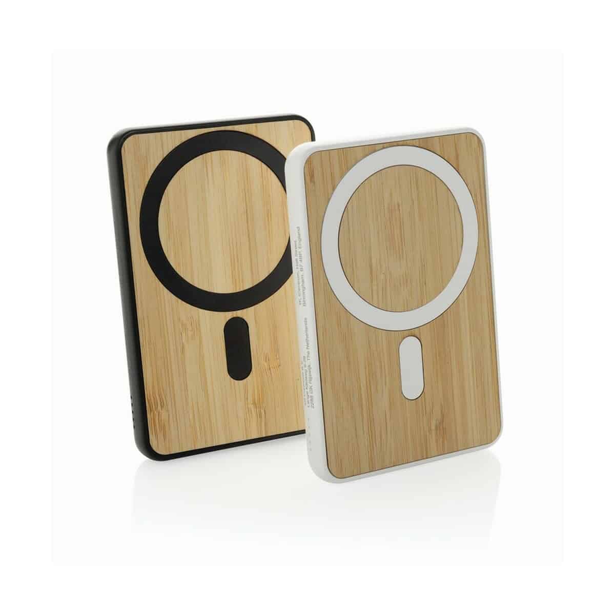 Magnetyczny bezprzewodowy power bank 5000 mAh 5W to nowoczesny, a zarazem przyjazny środowisku gadżet, który wprowadzi świeżą energię do każdej kampanii promocyjnej 😊. Wykonany z certyfikowanego bambusa FSC® i tworzywa RABS z recyklingu, posiada aż 22 % materiałów z odzysku, dzięki czemu podkreśla ekologiczne wartości Twojej marki. Kompaktowa obudowa o wymiarach 10,3 × 6,8 × 1,3 cm znakomicie leży w dłoni, a magnetyczna cewka umożliwia bezpieczne, stabilne ładowanie smartfonów obsługujących technologię QI. Wbudowane diody LED jasno wskazują poziom energii, a port USB-C pełni funkcję zarówno wejścia, jak i wyjścia, co znacząco upraszcza użytkowanie.