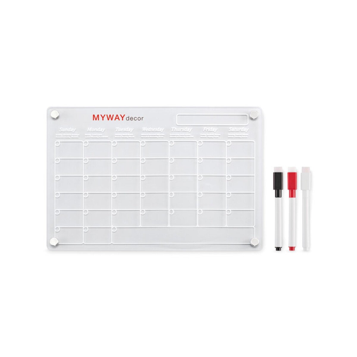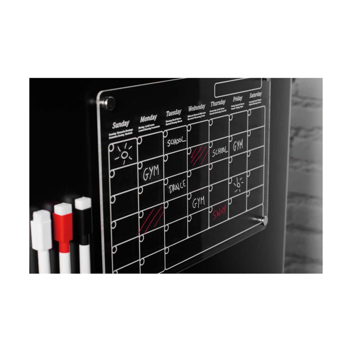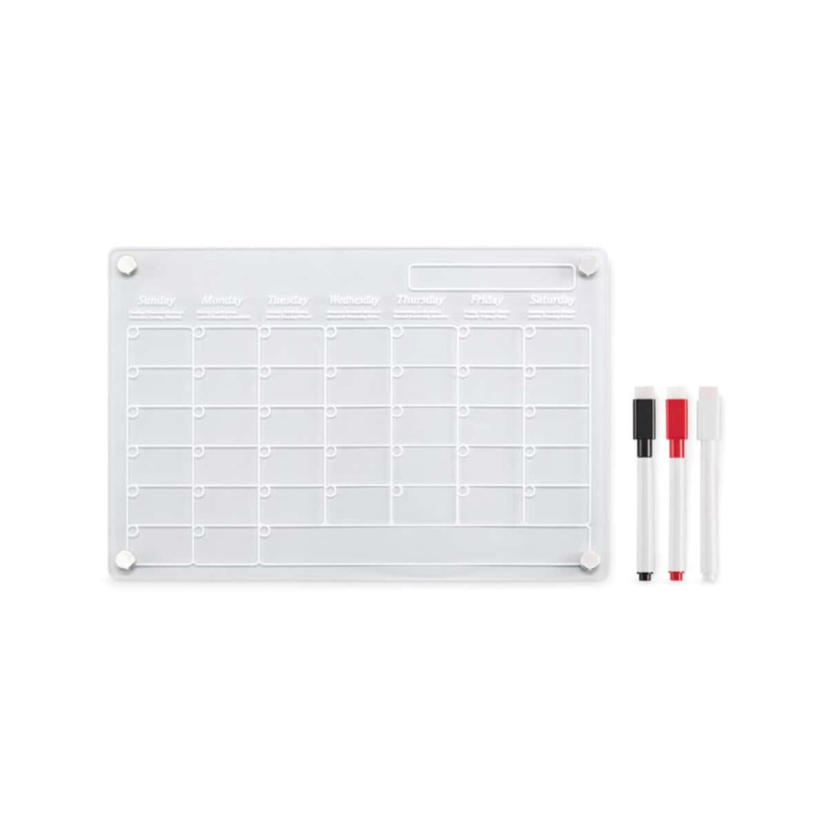 W zestawie otrzymujesz trzy magnetyczne, wymazywalne markery w kolorze czarnym, czerwonym i białym, które „przykleją się” dokładnie tam, gdzie ich potrzebujesz. Planer wykonano z trwałego, przezroczystego akrylu, co nadaje mu nowoczesny sznyt i chroni przed zarysowaniami. Wymiary: 30×20 cm, waga: 0,335 kg – lekki, a jednocześnie stabilny. Do kompletu dołączono śruby montażowe, więc możesz zawiesić go na ścianie lub metalowej powierzchni i stworzyć własne centrum dowodzenia 📅.
