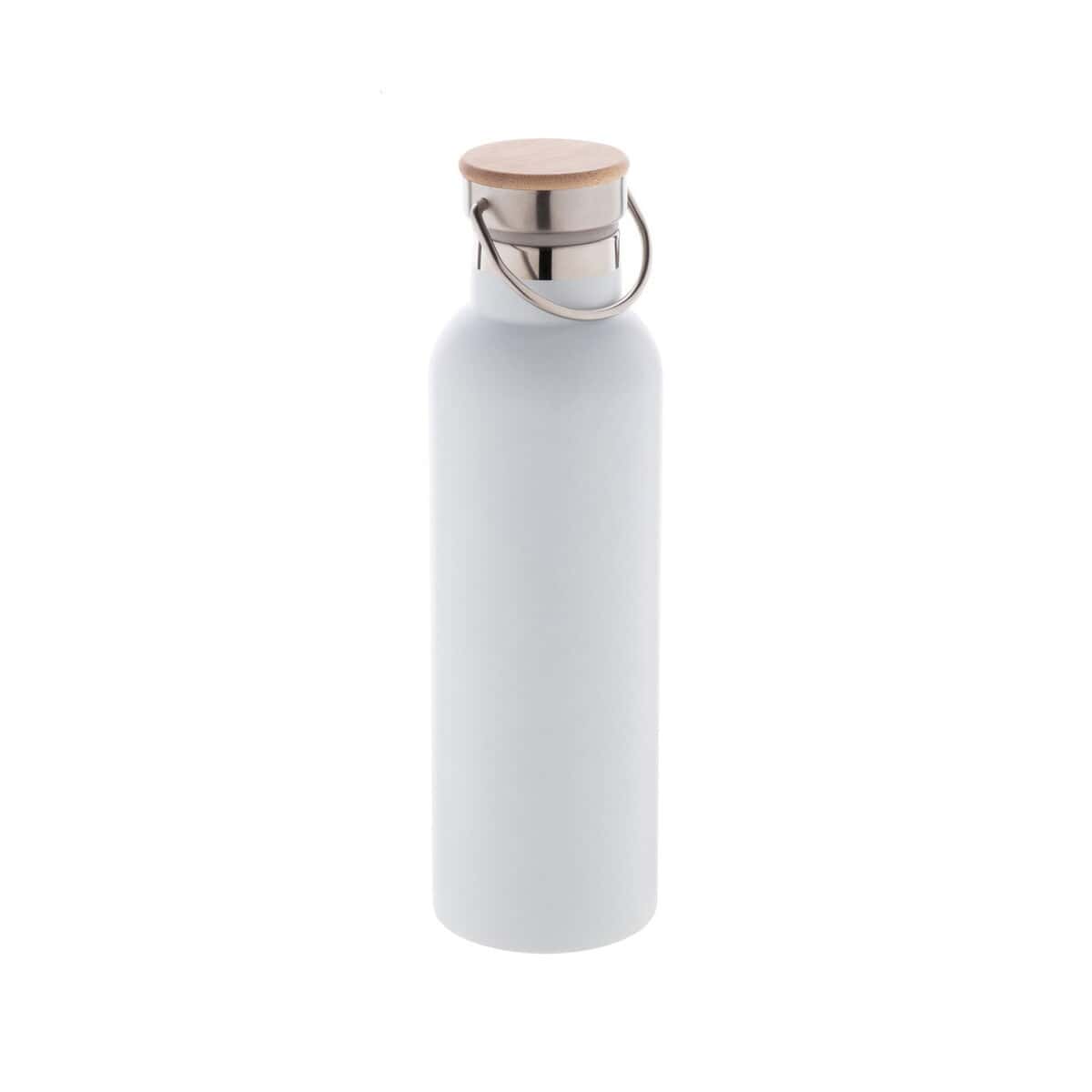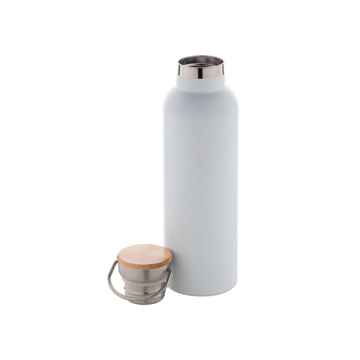 Butelkę wykonano z stali nierdzewnej o podwójnych ściankach z izolacją próżniową, co gwarantuje, że napoje pozostają gorące nawet do 12 godzin, a zimne do 24 godzin. Naturalna pokrywka z bambusu nadaje całości stylu eko oraz podkreśla dbałość o środowisko, a przy masie jedynie 400 g pozostaje lekka i praktyczna. Dostępne kolory – biały i srebrny – tworzą neutralne tło, dzięki czemu każdy nadruk firmowy będzie czytelny i elegancki.