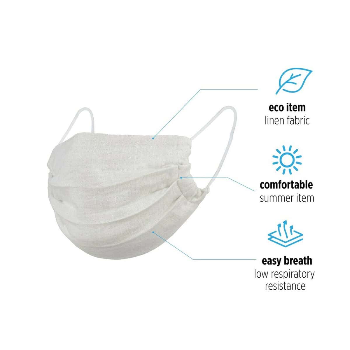 Model jest dwuwarstwowy, wykonany w 100 % z naturalnego lenu, co zapewnia przyjemny kontakt ze skórą i świetną cyrkulację powietrza. Wysoką jakość potwierdza certyfikat OEKO-TEX Standard 100. Maseczkę można prać – pierwsze pranie w 30 °C, kolejne w 40 °C – a także poddawać sterylizacji wodnej w 100 °C i prasować do 200 °C. Elastyczne mocowania gwarantują komfort nawet przy wielogodzinnym noszeniu, a niewielka waga 12 g i kompaktowe wymiary 17,5 × 9 cm (15 cm po rozłożeniu) ułatwiają przechowywanie.