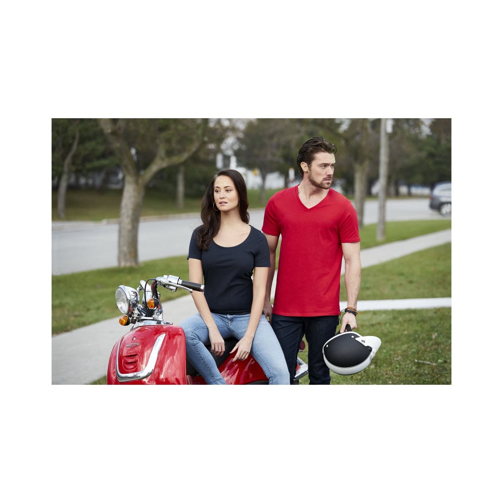 Ta koszulka to idealny wybór dla wszystkich, którzy cenią sobie wygodę i komfort. Wykonana z miękkiej, oddychającej tkaniny, zapewnia doskonałą swobodę ruchu. Wyjątkowy design z widocznymi detalami takimi jak brak szwów bocznych, V-neck, taśma wzmacniająca od ramienia do ramienia oraz podwójny szew. Kontrastowa pętelka na wieszak jest przydatnym dodatkiem, a metka wdrukowana transferem dla lepszego komfortu uzupełnia całość. To połączenie idealne dla każdego, kto szuka wygodnego ubrania na co dzień.