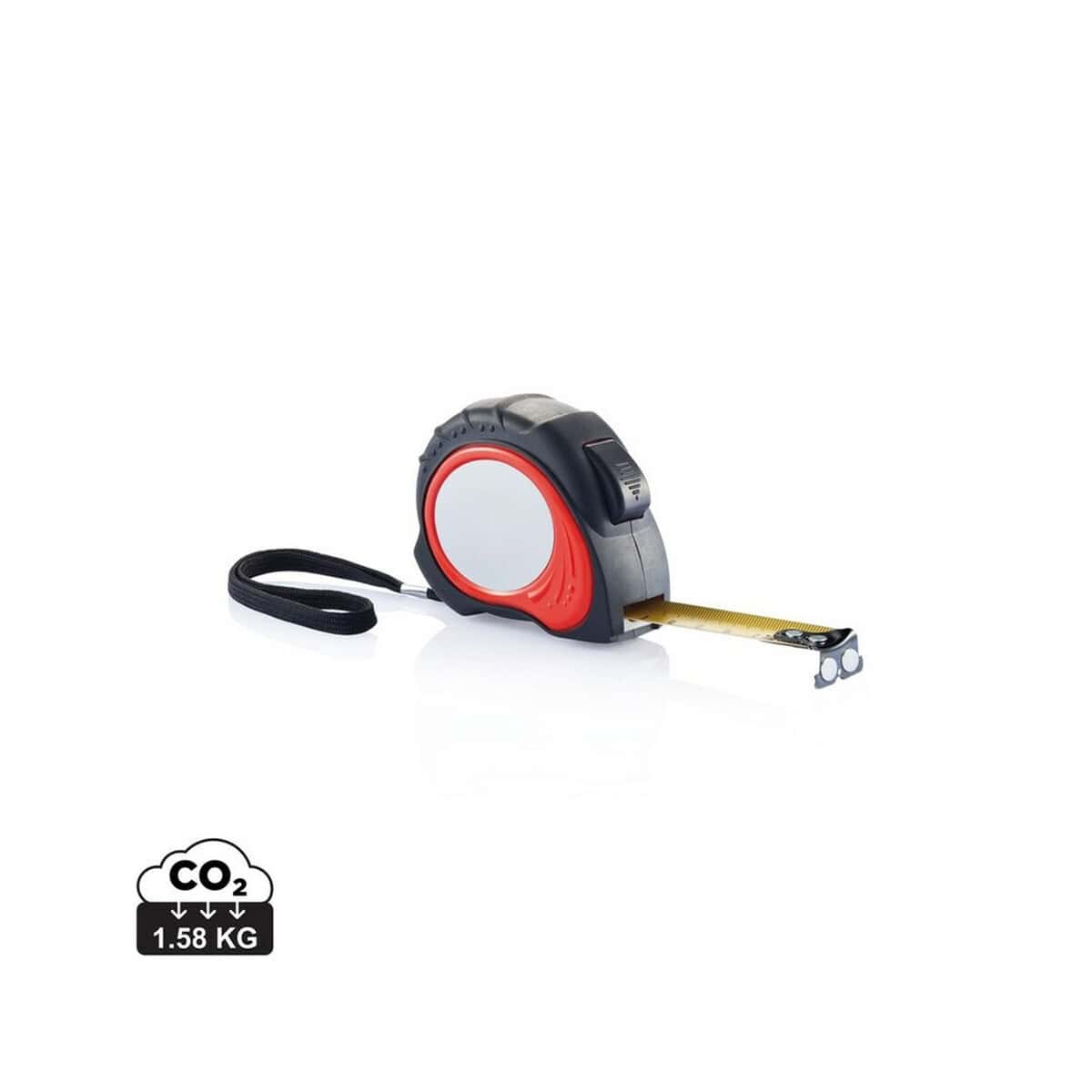 Na bocznej ściance znajduje się matowa naklejka z PVC przeznaczona pod wyraźny nadruk oraz logo, dzięki czemu Miara 5m Tool Pro staje się nie tylko niezawodnym narzędziem, ale i efektywnym nośnikiem reklamy. Niewielki ślad węglowy 1,58 kg CO2 czyni produkt atrakcyjniejszym dla firm dbających o zrównoważony rozwój.