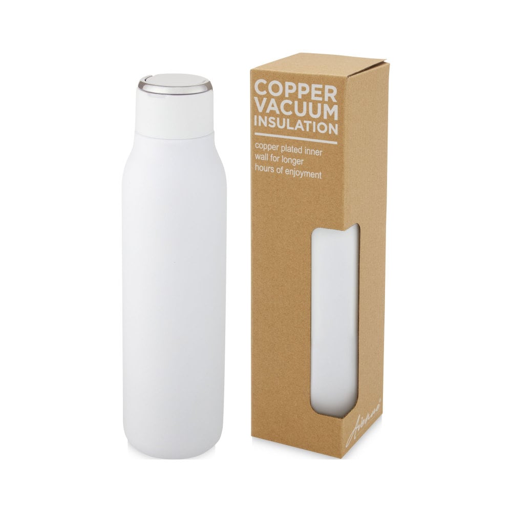 Butelka Marka to trwała, luksusowa konstrukcja próżniowa ze stali nierdzewnej 18/8 i miedzianej izolacji, która utrzymuje temperaturę napojów przez kilka godzin. Wykończona modnym lakierem proszkowym, jest wolna od BPA, przetestowana i zatwierdzona zgodnie z niemiecką ustawą o bezpieczeństwie żywności (LFGB) oraz przepisami REACH. Dodatkowo zapobiega skraplaniu się wody na zewnątrz dzięki zakręcanej, odpornej na rozlanie pokrywce. Wyposażona jest w trwałą, wykonaną ze stopu cynku pętelkę na rękę i pasuje do większości standardowych uchwytów samochodowych. Pojemność 600 ml. Zaleca się mycie ręczne. Butelka Marka jest dostarczana w kartonowym pudełku upominkowym wykonanym z materiałów pochodzących z recyklingu.