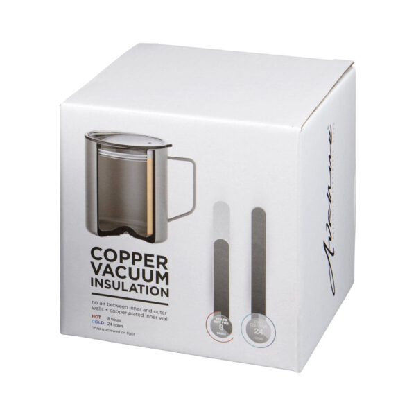Kubek Avenue z dwuwarstwową próżniową konstrukcją wykonaną ze stali nierdzewnej i miedzianą izolacją gwarantuje doskonałe warunki przechowywania napojów. Kubek utrzymuje niską temperaturę napojów przez 24 godziny, a wysoką przez co najmniej 6 godzin, a jego konstrukcja zapobiega również kondensacji na zewnątrz. Wciskana pokrywa jest odporna na przeciekanie. Modna trwała powłoka na kubku pokryta jest malowana proszkowo. Kubek posiada pojemność 420ml i jest zapakowany w eleganckie pudełko upominkowe.