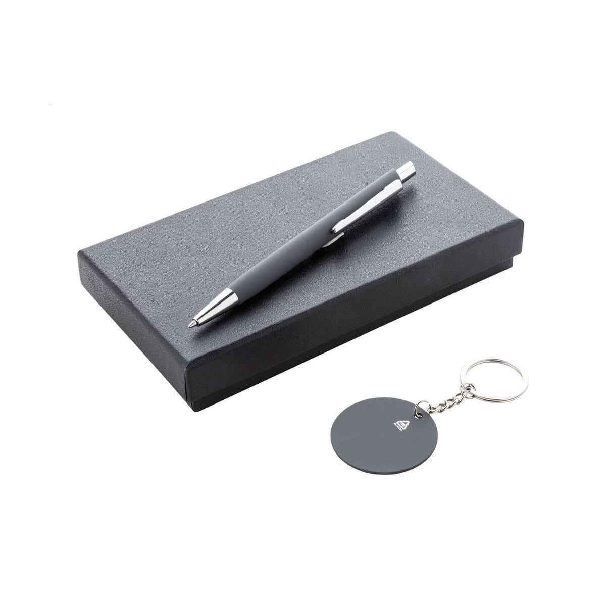 Miroset zestaw długopis i brelok to elegancki duet stworzony z myślą o wymagających markach, które chcą zachwycić swoich odbiorców funkcjonalnym prezentem z charakterem 😊. W skład zestawu wchodzi długopis z recyklingowanego aluminium o gumowanej powierzchni oraz brelok ze stali nierdzewnej, również pokryty przyjemną w dotyku gumą. Oba elementy pokryto specjalną powłoką umożliwiającą efektowny grawer laserowy o lustrzanym połysku, dzięki czemu Twoje logo lub precyzyjny nadruk będą przyciągać wzrok i podkreślać klasę upominku.