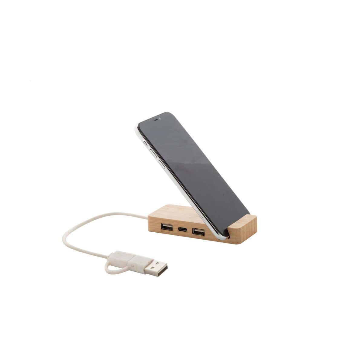 Mobaru hub USB to niezwykle praktyczny i ekologiczny gadżet, który łączy w sobie funkcję huba z wygodnym uchwytem na smartfon. Wykonany z naturalnego bambusa, o kompaktowych wymiarach 105×45×16 mm i lekkiej wadze 110 g, prezentuje się elegancko na każdym biurku, podkreślając nowoczesny charakter marki. Dzięki dwóm portom USB oraz jednemu portowi USB-C (standard 2.0) pozwala na jednoczesne ładowanie i synchronizację kilku urządzeń, co czyni go doskonałym wsparciem w codziennej pracy biurowej. 😊