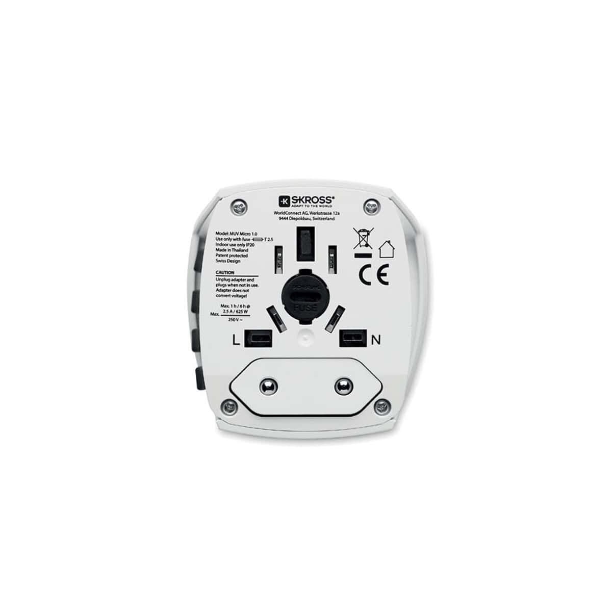 MUV micro. 2-pole MUV MICRO to kompaktowy, a zarazem niezwykle funkcjonalny adapter podróżny, który sprawi, że żadna zagraniczna wyprawa nie zaskoczy Cię brakiem odpowiedniego gniazdka 🙂 Zaprojektowany przez ekspertów SKROSS, adapter współpracuje z sieciami elektrycznymi w Europie, USA, Japonii, Australii i Chinach, co czyni go rozwiązaniem doskonałym dla globtroterów, przedstawicieli handlowych i całych ekip eventowych. Dzięki 2-biegunowej konstrukcji bez uziemienia spełnia wszystkie międzynarodowe normy bezpieczeństwa, a wbudowane przesłony chronią najmłodszych podróżników.