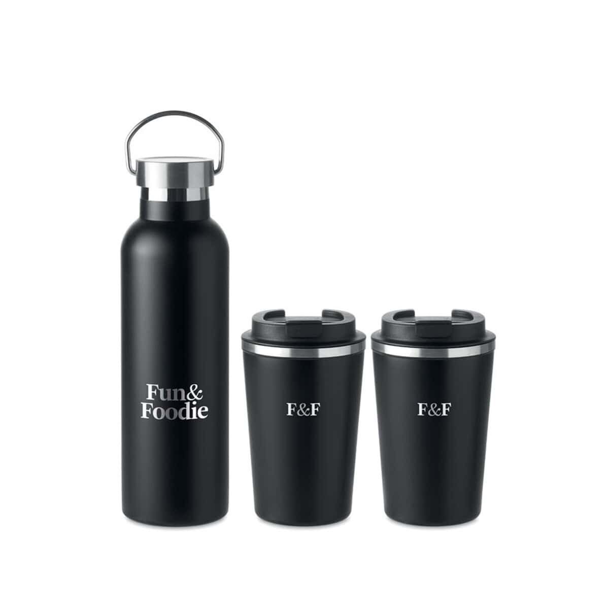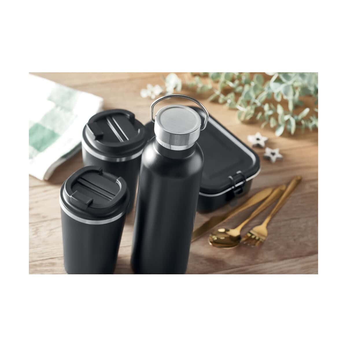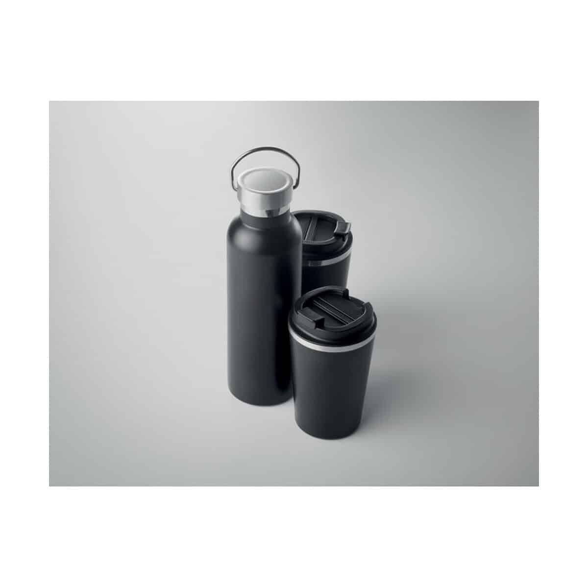 Zestaw dostępny jest w klasycznym kolorze czarnym, co nadaje mu uniwersalnej elegancji i sprawia, że pasuje do każdego stylu. To doskonały upominek dla pracowników, partnerów biznesowych oraz uczestników eventów czy konferencji. Z powodzeniem wykorzystasz go w kampaniach zdrowego stylu życia, wydarzeniach sportowych, akcjach zero waste, a nawet jako premium reklamowe uzupełnienie firmowych welcome packów 👍.