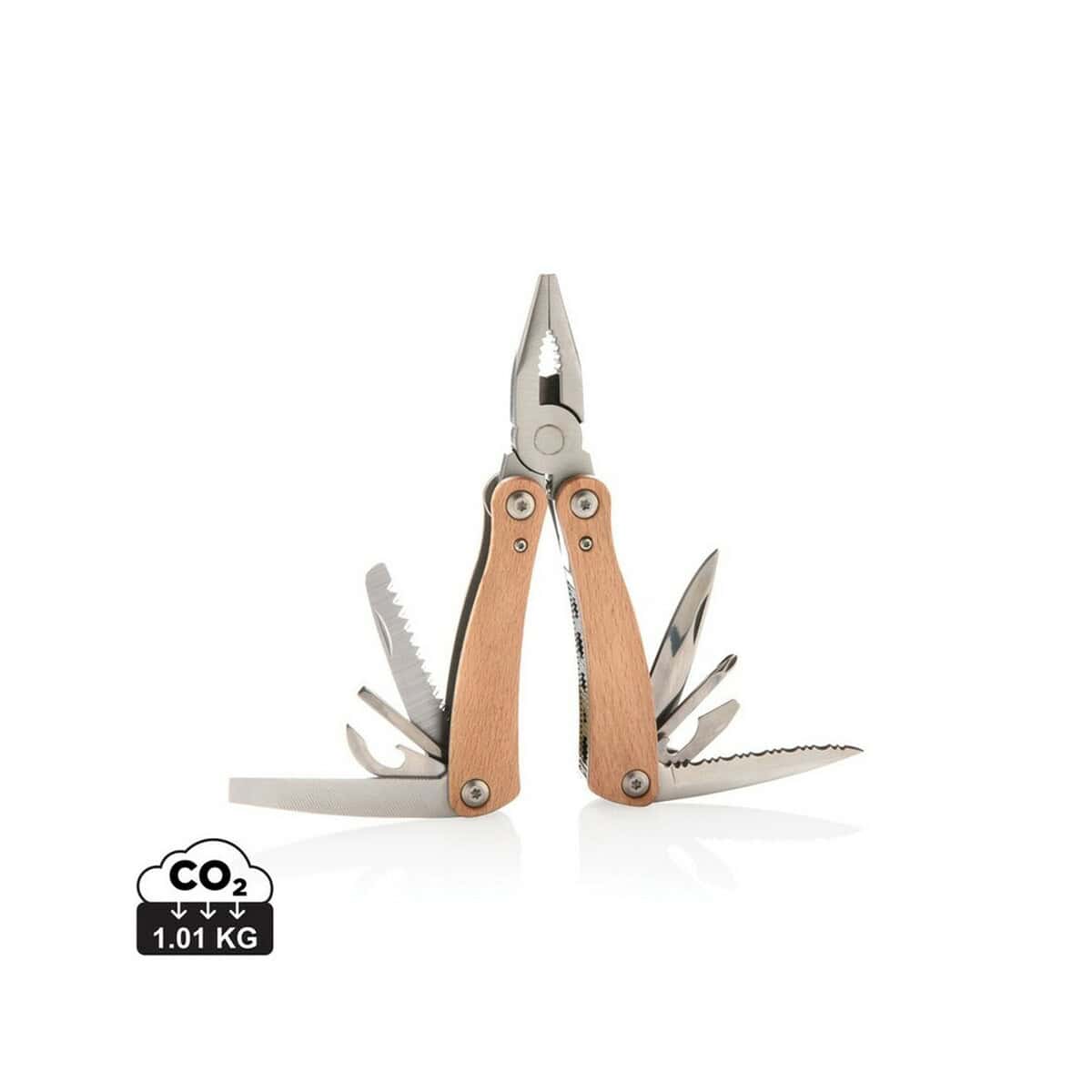 W zestawie znajdziesz: długie szczypce, kombinerki, przecinak do kabli i drutu, ostrze ząbkowane, otwieracz do butelek, duży śrubokręt płaski, śrubokręt krzyżakowy, nóż, piłę, mały śrubokręt płaski, otwieracz do puszek, średni śrubokręt płaski oraz pilnik. To doprawdy bezkonkurencyjne wyposażenie w jednym, poręcznym korpusie! Niewielki ślad węglowy produktu – zaledwie 1,01 kg CO₂ – czyni go wyborem przyjaznym dla środowiska 🌱.
