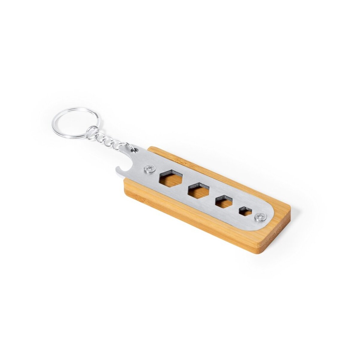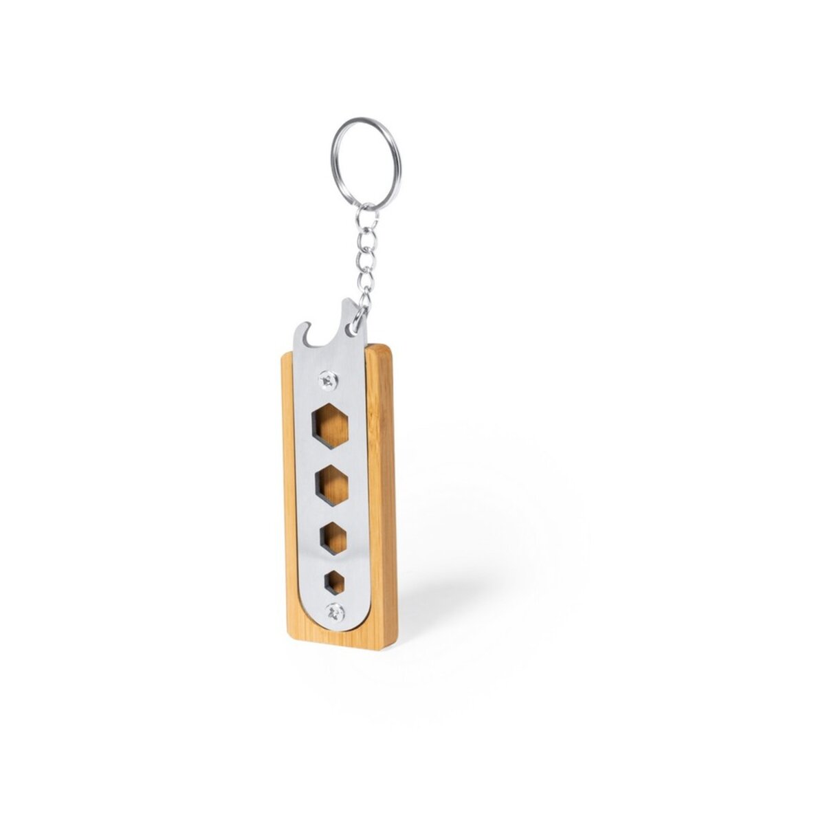 Narzędzie wielofunkcyjne, 5 funkcji, brelok do kluczy to niezastąpiony gadżet dla każdego, kto ceni sobie funkcjonalność i efektywność. Wykonane z naturalnego bambusa i trwałej stali nierdzewnej, łączy w sobie elegancję z praktycznym zastosowaniem. Ten kompaktowy brelok nie tylko pomoże Ci organizować klucze, ale również oferuje cztery klucze imbusowe oraz praktyczny otwieracz do butelek, sprawiając, że jest on przydatny w wielu sytuacjach.