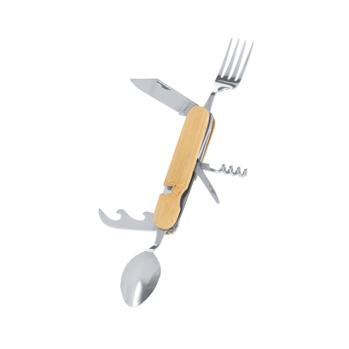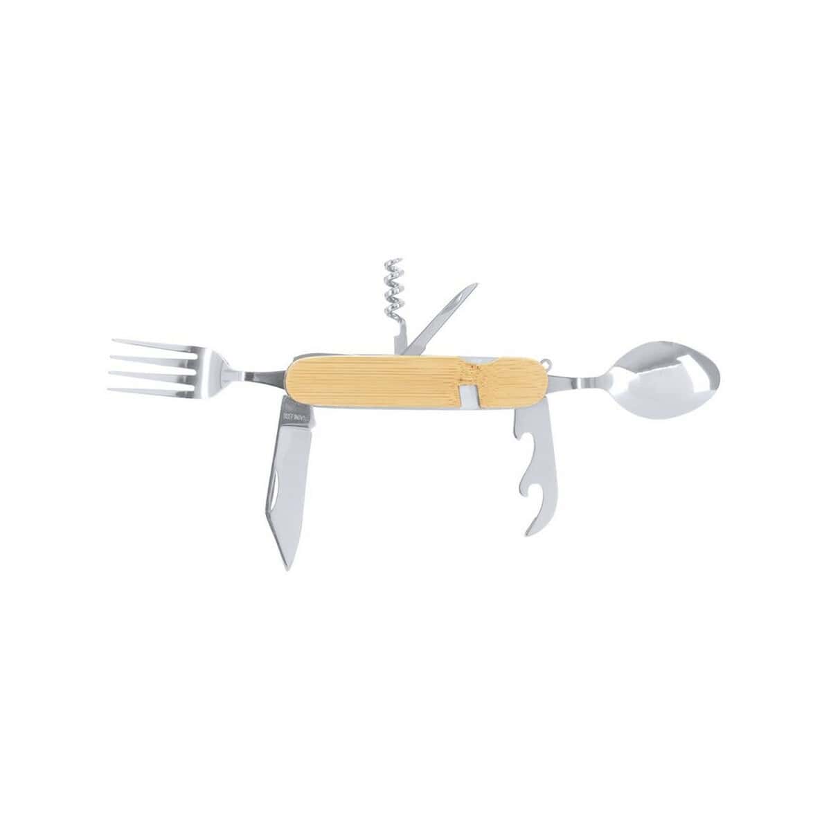 Narzędzie wielofunkcyjne, 7 funkcji to prawdziwy mistrz praktyczności, który w niewielkiej formie 3,9 x 11 x 3,2 cm łączy aż siedem niezbędnych akcesoriów: łyżkę, nóż, widelec, korkociąg, podwójny otwieracz, pilnik do paznokci oraz składany uchwyt. Wykonane z naturalnego bambusa i wytrzymałej stali nierdzewnej urządzenie waży jedynie 150 g, dzięki czemu bez trudu zmieści się w kieszeni kurtki, saszetce czy schowku samochodowym 😊.