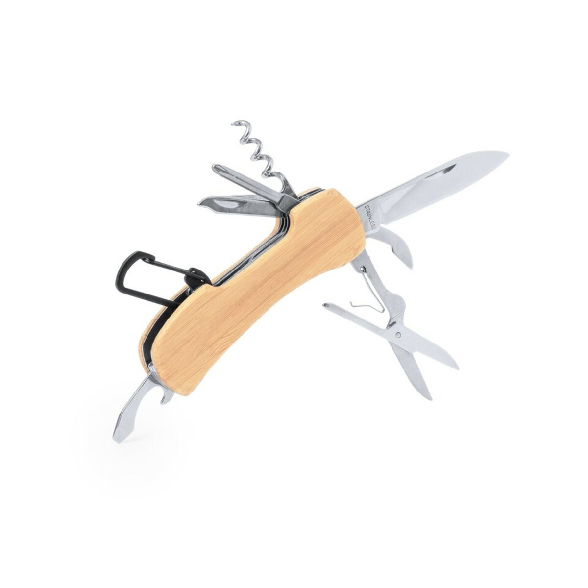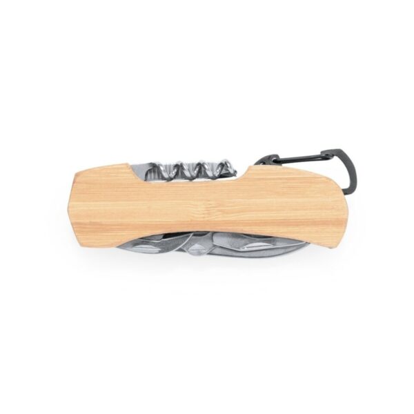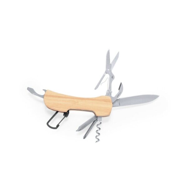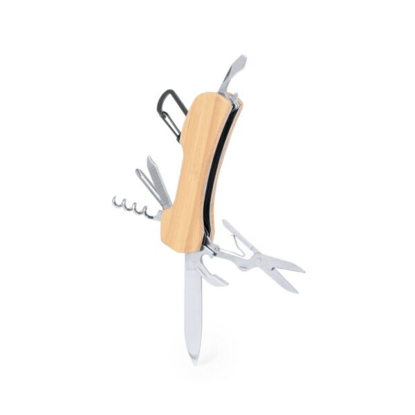 W skład tego kompaktowego narzędzia wchodzi: nożyce, otwieracz do puszek, otwieracz do butelek, płaski śrubokręt, korkociąg, śrubokręt krzyżakowy, pilnik do paznokci. Dodatkowo, scyzoryk jest wyposażony w stylowy i trwały bambusowy uchwyt, który zapewnia wygodę użytkowania oraz elegancki wygląd.