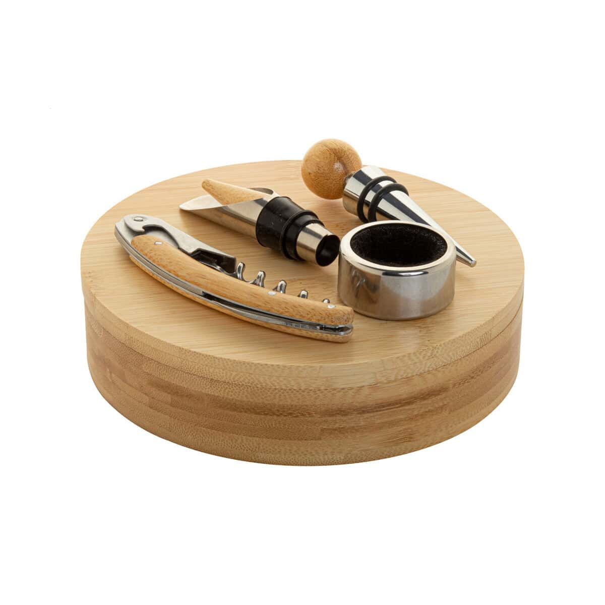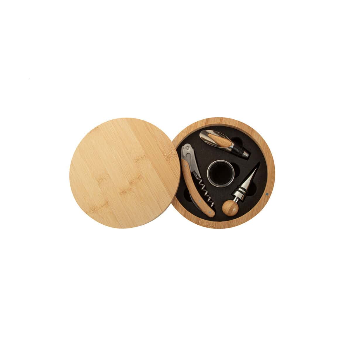 Nebbiolo zestaw do wina to wyrafinowany, a zarazem niezwykle praktyczny gadżet przeznaczony dla koneserów trunków szlachetnych oraz firm, które chcą podkreślić swoją klasę i ekologiczne podejście 😊. Wykonany z przyjaznego środowisku Bambusu i eleganckiej Stal nierdzewnay, zamknięty w okrągłym pudełku w naturalnym kolorze, zachwyca designem oraz funkcjonalnością. W zestawie znajdziesz wszystko, czego potrzeba do serwowania wina: korkociąg, ociekacz, lejek i zatyczkę, a całość waży zaledwie 430 g przy kompaktowym rozmiarze ø160×40 mm. Dzięki gładkiej powierzchni bambusu łatwo umieścisz tu wyrazisty nadruk lub dyskretne logo, które sprawi, że komplet stanie się unikalnym upominkiem reklamowym dla Twoich partnerów biznesowych.