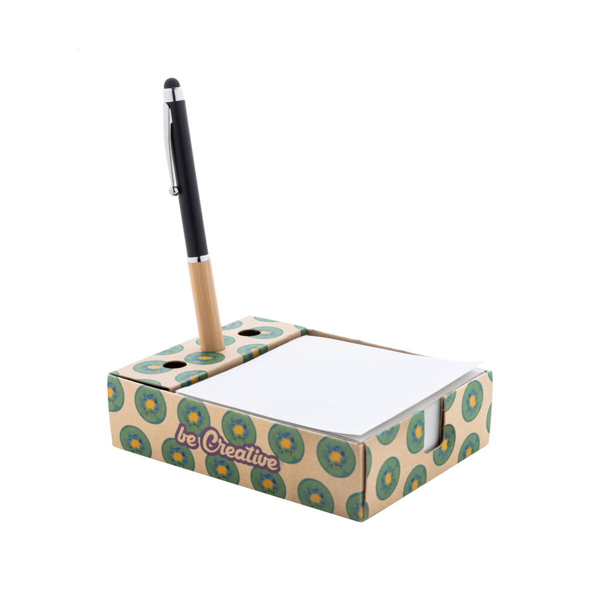 Nolty Eco uchwyt na długopis z notatnikiem / karteczki to niezwykle praktyczny, a przy tym atrakcyjny wizualnie gadżet, który wyróżni każdą kampanię promocyjną 🌿. Wykonany z przyjaznego środowisku papieru z recyklingu, przybornik łączy w sobie funkcję stojaka na pióro czy marker oraz bloczek aż 300 karteczek memo 90×90 mm. Dzięki temu wszystko, co najważniejsze, masz zawsze pod ręką – na biurku w biurze, w recepcji hotelowej czy na stanowisku targowym.
