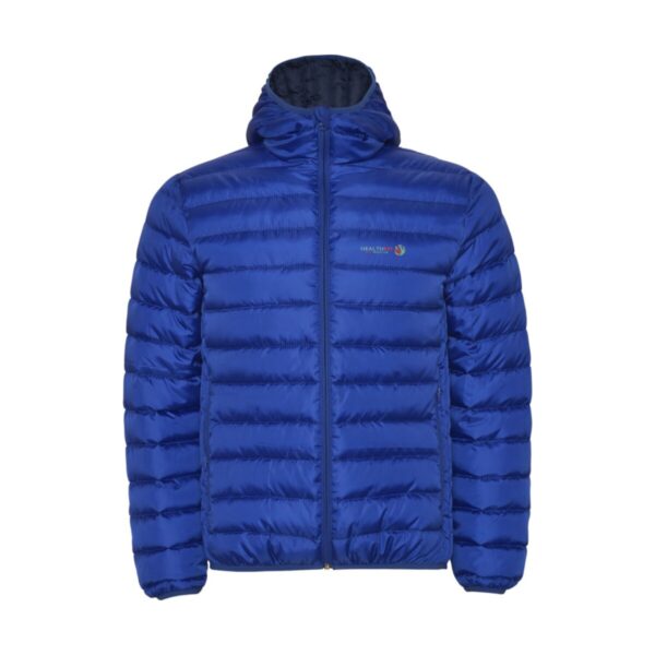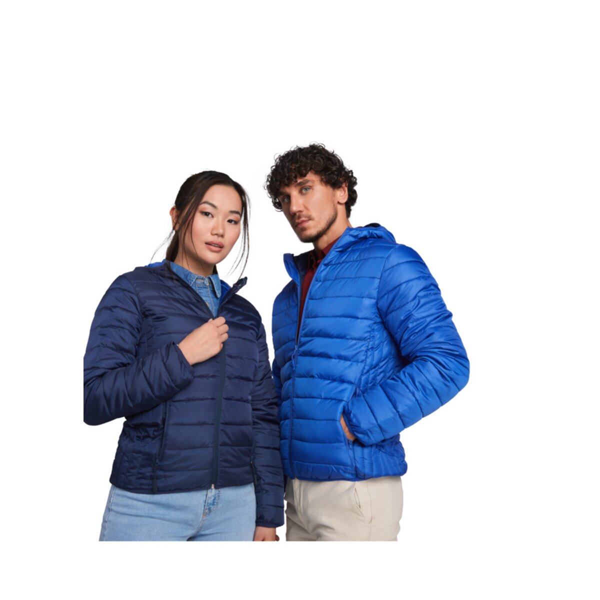 Męska pikowana kurtka z dopasowanym kapturem z materiału przypominającego w dotyku pierze. Odwrócone zamki błyskawiczne z dopasowaną osłoną podbródka. Dwie przednie kieszenie zapinane na zamek. Dopasowane elastyczne wykończenia mankietów, dołu i kaptura. Kontrastowa wewnętrzna podszewka. Dołączona torba transportowa. Lekka i składana odzież. Wodoodporna. Model wiatroszczelny.
