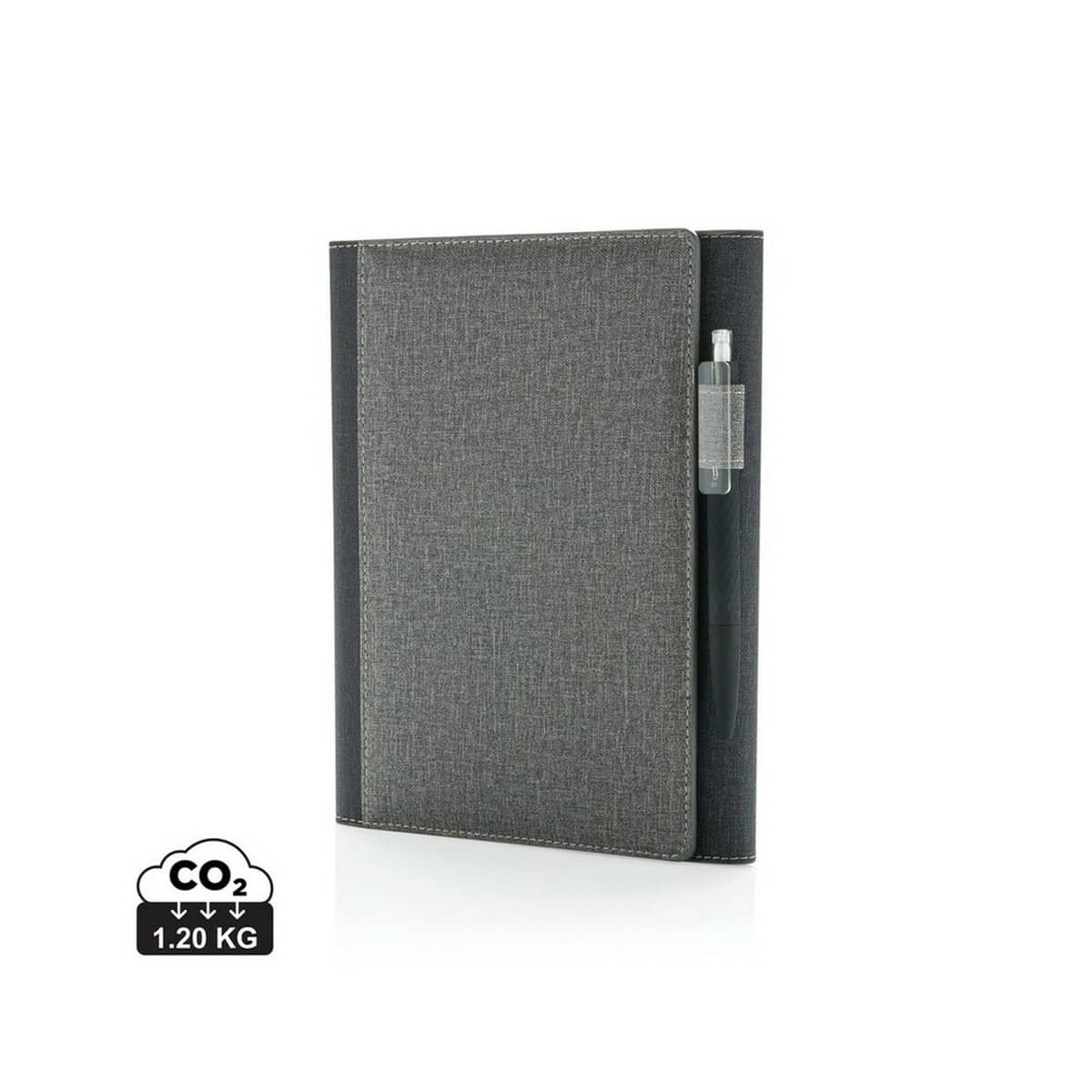 Notatnik A5 Deluxe to znakomity, wielofunkcyjny gadżet biurowy, który w niezwykle elegancki sposób podkreśli wizerunek każdej marki. Dzięki okładce z wysokogatunkowego materiału PU w modnym, uniwersalnym szarym kolorze oraz precyzyjnemu magnetycznemu zapięciu, notatnik od razu przykuwa uwagę i budzi zaufanie odbiorcy 😊. Wymiary 17 × 22 × 2 cm sprawiają, że mieści się w torbie lub plecaku, a jednocześnie oferuje komfort pisania jak pełnowymiarowy notes. Aż 64 kremowe kartki 80 g/m² w linie to odpowiednia powierzchnia na spotkaniowe notatki, szkice koncepcji czy planowanie projektów, a po zapisaniu całości wystarczy wymienić wkład — okładka jest wielokrotnego użytku, co sprzyja ekologii i dodatkowo akcentuje niski ślad węglowy produktu wynoszący jedynie 1,2 kg CO₂.