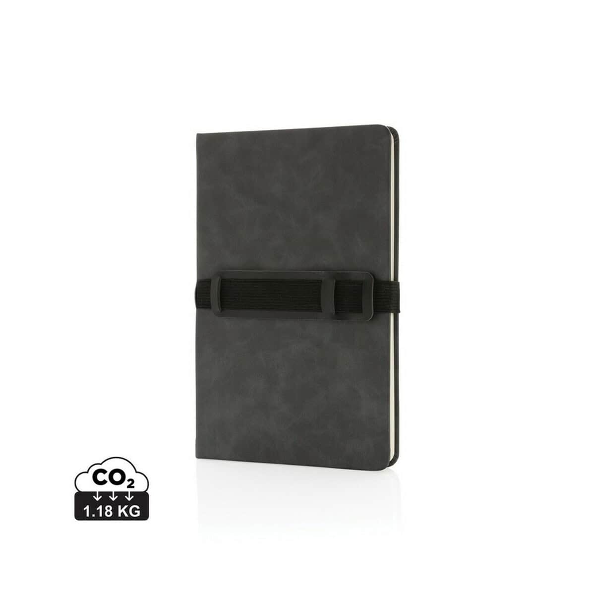 Na froncie znajduje się praktyczna, elastyczna opaska – pomieści telefon i ulubiony długopis, dzięki czemu wszystkie niezbędne akcesoria masz zawsze pod ręką. Ten detal czyni notatnik szczególnie atrakcyjnym dla branż takich jak konsulting, szkolenia, IT czy finanse, gdzie mobilność i organizacja idą w parze. Obniżony ślad węglowy produktu: 1,18 kg CO₂ sprawia, że to wybór przyjazny środowisku, co doceni każda firma akcentująca proekologiczną strategię 🌱.