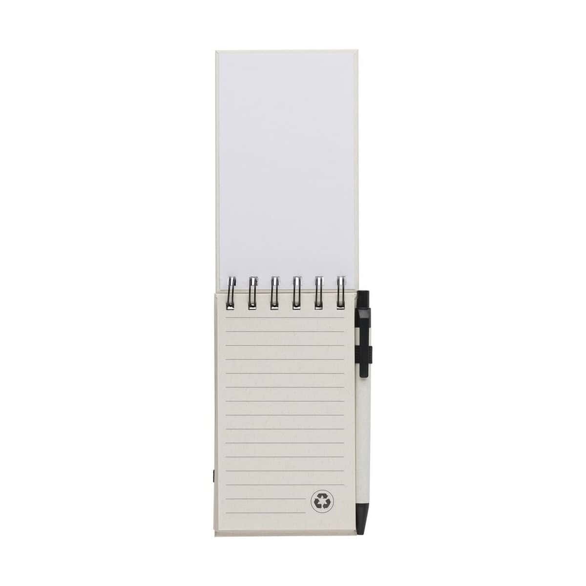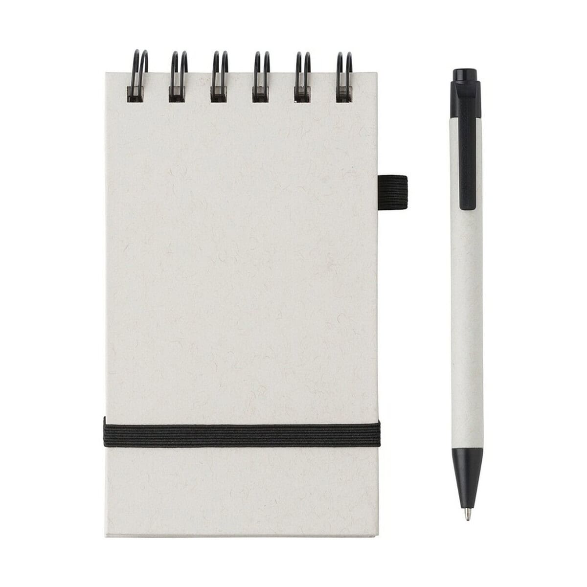 Do zestawu dołączono lekki długopis z niebieskim wkładem, wykonany z połączenia abs i plastiku. Całość utrzymana jest w neutralnym kolorze białym, dzięki czemu prezentuje się minimalistycznie i świetnie eksponuje logo lub nadruk reklamowy. Na okładce znajdziesz przestrzeń, którą możemy zadrukować dowolną grafiką, hasłem lub danymi kontaktowymi dla Twojej firmy. To doskonały, a zarazem subtelny sposób na budowanie rozpoznawalności marki podczas spotkań biznesowych, konferencji czy targów branżowych.
