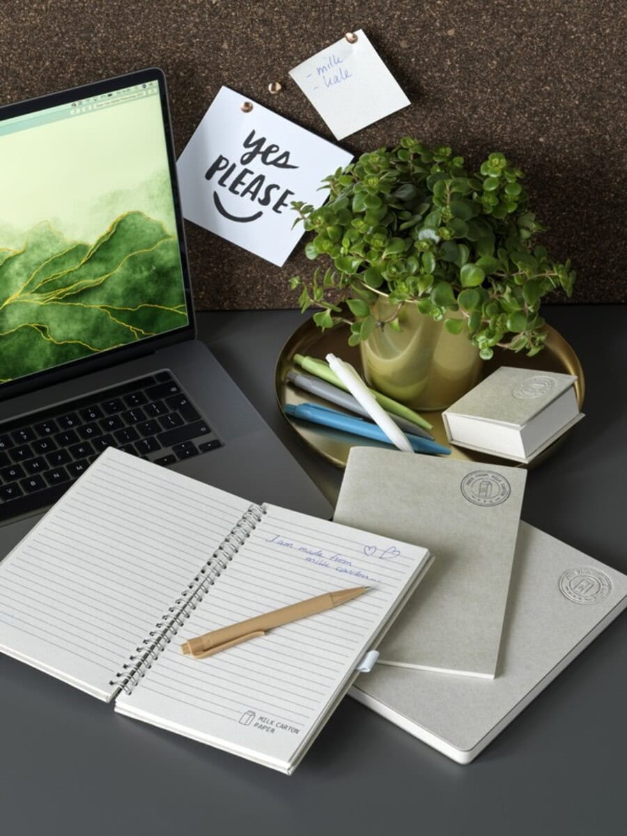 Największym atutem jest jednak proekologiczne serce produktu: aż do 70% materiału stanowi karton z recyklingu pozyskiwany z przetworzonych opakowań po mleku. Zużyte kartony są zbierane, sortowane, mielone i zamieniane w papier, dzięki czemu odpady dostają nowe życie. W rezultacie Notatnik bez grzbietu Dairy Dream w formacie A5 staje się nośnikiem świadomego stylu, który podkreśla odpowiedzialność społeczną marki.