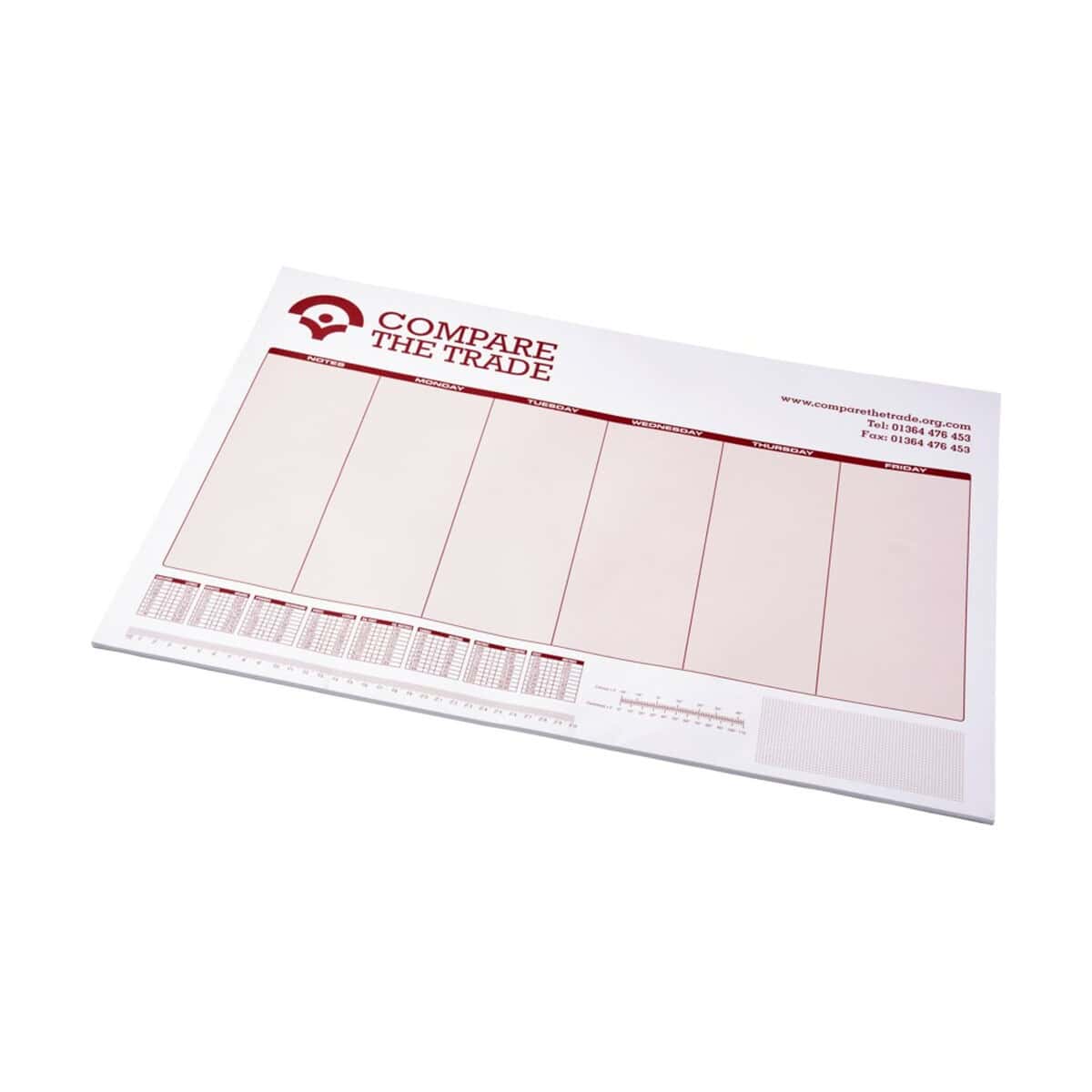 Notatnik Desk-Mate® w formacie A3 to znakomity gadżet biurowy, który już od pierwszego spojrzenia zachwyca czystą, śnieżnobiałą powierzchnią, gotową na kreatywne pomysły Twojej firmy. Duża przestrzeń 420 x 297 mm sprawia, że zarówno szkice koncepcyjne, mapy myśli, jak i notatki z burzy mózgów zyskują wygodne tło – 😊. Standardowe 50 kartek o gramaturze 80 g/m2 gwarantuje przyjemne pisanie bez przebijania atramentu, a dla bardziej wymagających dostępne są również warianty 25 lub 100 kartek. W każdej wersji możliwe jest indywidualne zdobienie każdego arkusza – od subtelnej stopki po pełnokolorowe grafiki, dzięki czemu każdy kartkowy detal pracuje na prestiżowe wrażenie z logo.