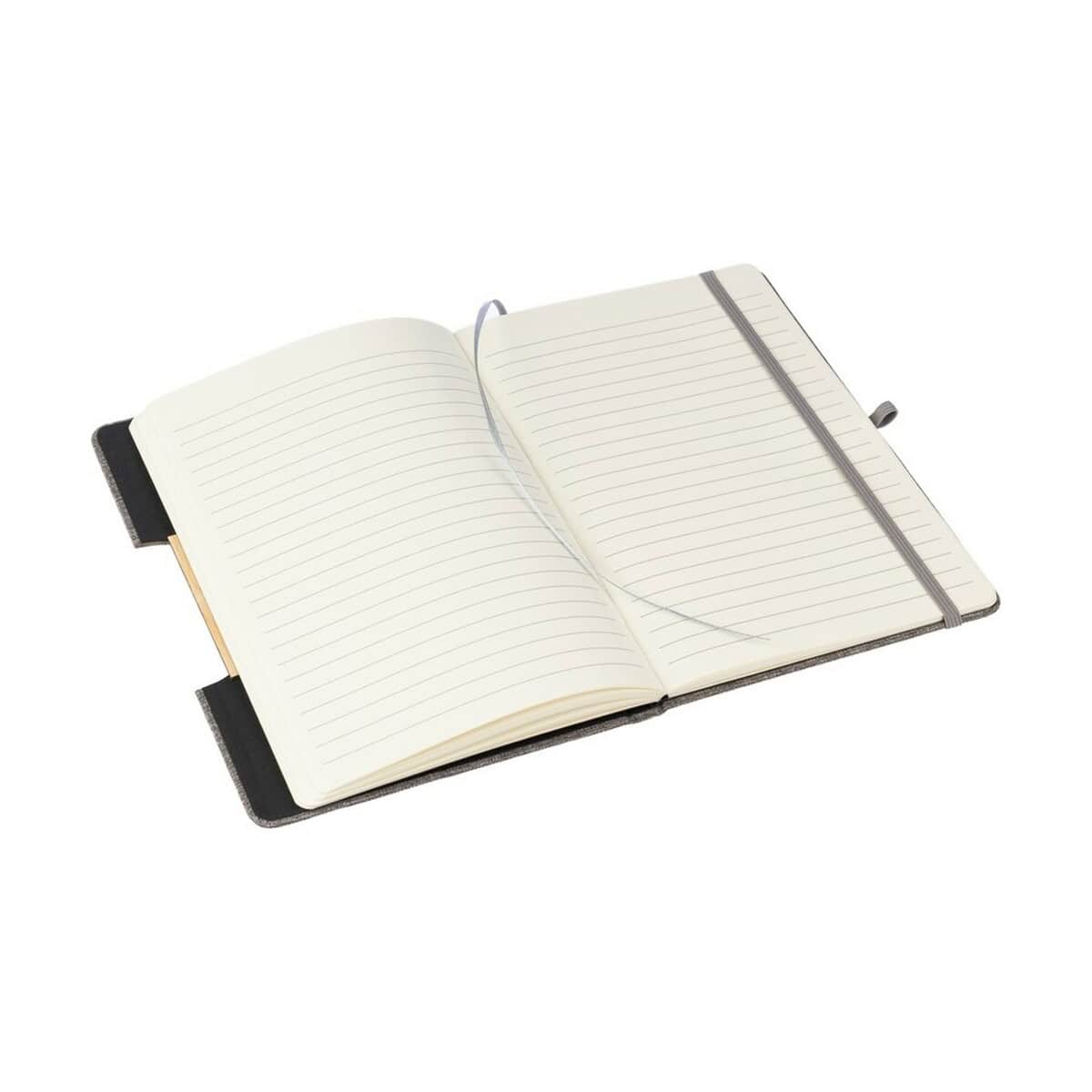 W środku czeka aż 80 stron w linie, na których z łatwością uporządkujesz notatki ze spotkań, szkic koncepcji kampanii czy listę zadań do wykonania. Wygodna tasiemka zakładkowa, dopasowana kolorystycznie do szarej, czarnej lub niebieskiej okładki, pozwala błyskawicznie odnaleźć ostatni wpis, a elastyczna opaska chroni kartki przed przypadkowym otwarciem. To drobiazgi, które sprawiają, że Notatnik ok. A5 RPET jest nie tylko estetyczny, lecz także niezwykle użyteczny 🙂.
