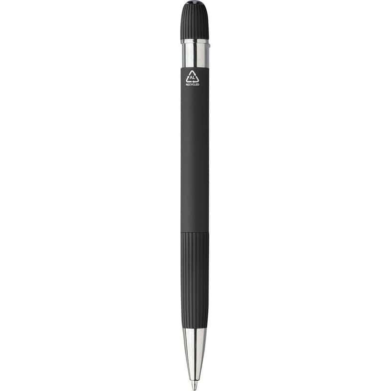 Notatnik ok. A5 z długopisem to niezwykle praktyczny, a zarazem stylowy gadżet, który wyróżni każdą kampanię reklamową. Format zbliżony do A5 łączy poręczność z wystarczającą przestrzenią na 100 stron w linie (70 g/m²), dzięki czemu możesz swobodnie planować projekty, sporządzać notatki ze spotkań czy prowadzić dziennik zadań ✍️. Twarda okładka z PU przypominającego sztruks jest nie tylko miła w dotyku, ale też trwała; chroni kartki podczas codziennych podróży i na eventach branżowych. W komplecie znajduje się długopis z gumowym wykończeniem i paskowanymi detalami, a chromowana końcówka dodaje elegancji. Obie części zestawu ozdobione są subtelną ikoną recyklingu, co podkreśla odpowiedzialny charakter produktu.