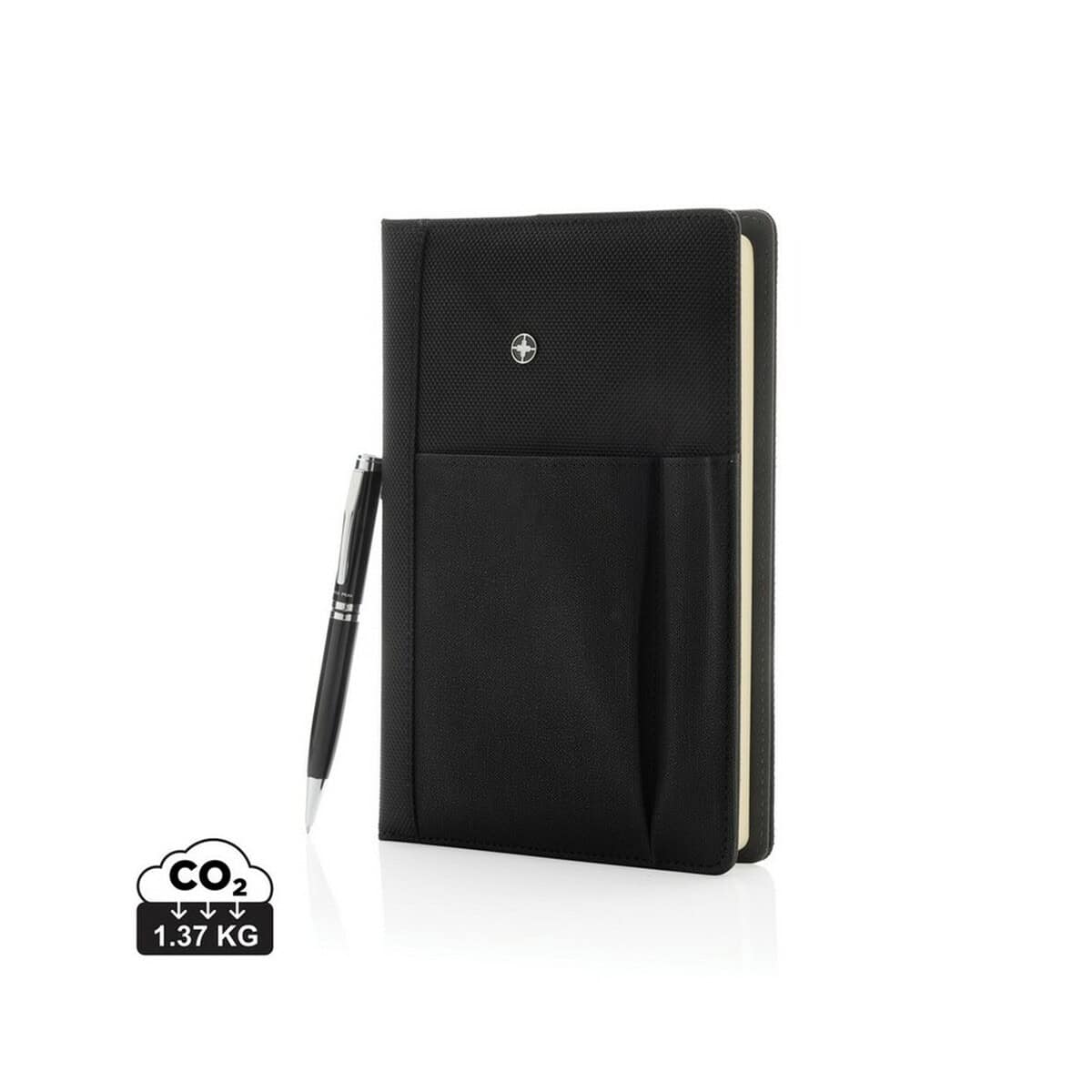 Notatnik Swiss Peak ok. A5, długopis to znakomity duet, który zamieni każdy pomysł w profesjonalny projekt. W eleganckiej, czarnej okładce z wytrzymałego poliestru 1680D i 600D kryje się 96 kartek papieru 80 g/m² – perfekcyjna gramatura, by pisać bez przebijania na drugą stronę. Wbudowana kieszonka pomieści smartfon, wizytówki lub drobne akcesoria, a cały zestaw umieszczono w gustownym pudełku podarunkowym Swiss Peak. Dzięki kompaktowym wymiarom 2 × 16,7 × 23,3 cm i wadze zaledwie 550 g produkt sprawdzi się w biurze, w plenerze oraz w podróży ✈️.