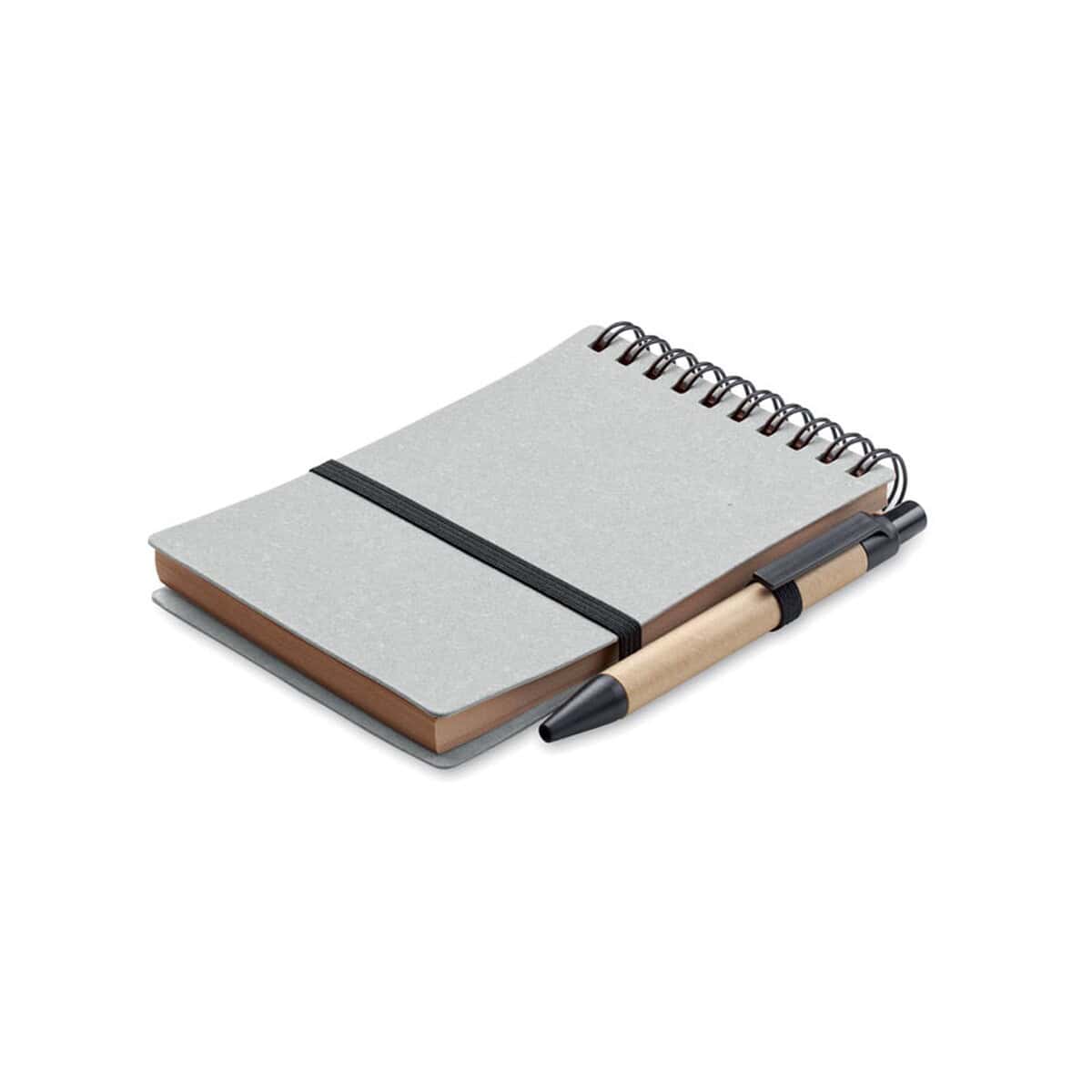 Notatnik z recyklingu z długopi NOTIE to przyjazny środowisku, a jednocześnie elegancki sposób na wyróżnienie marki w kategorii Notatniki z logo 😊. Wykonany z aż 70% papieru z recyklingu oraz 30% PU, zachwyca naturalną estetyką w odcieniach szarości i brązu, podkreślając proekologiczne wartości Twojej firmy. Ten kompaktowy format 9 × 13 cm sprawia, że notatnik zmieści się w kieszeni marynarki, damskiej torebce czy plecaku studenta. Do zestawu dołączono dopasowany długopis z kartonu z recyklingu z niebieskim tuszem, który mieści się w elastycznym uchwycie na długopis – dzięki temu masz zawsze wszystko pod ręką.