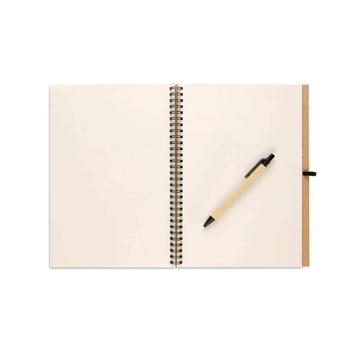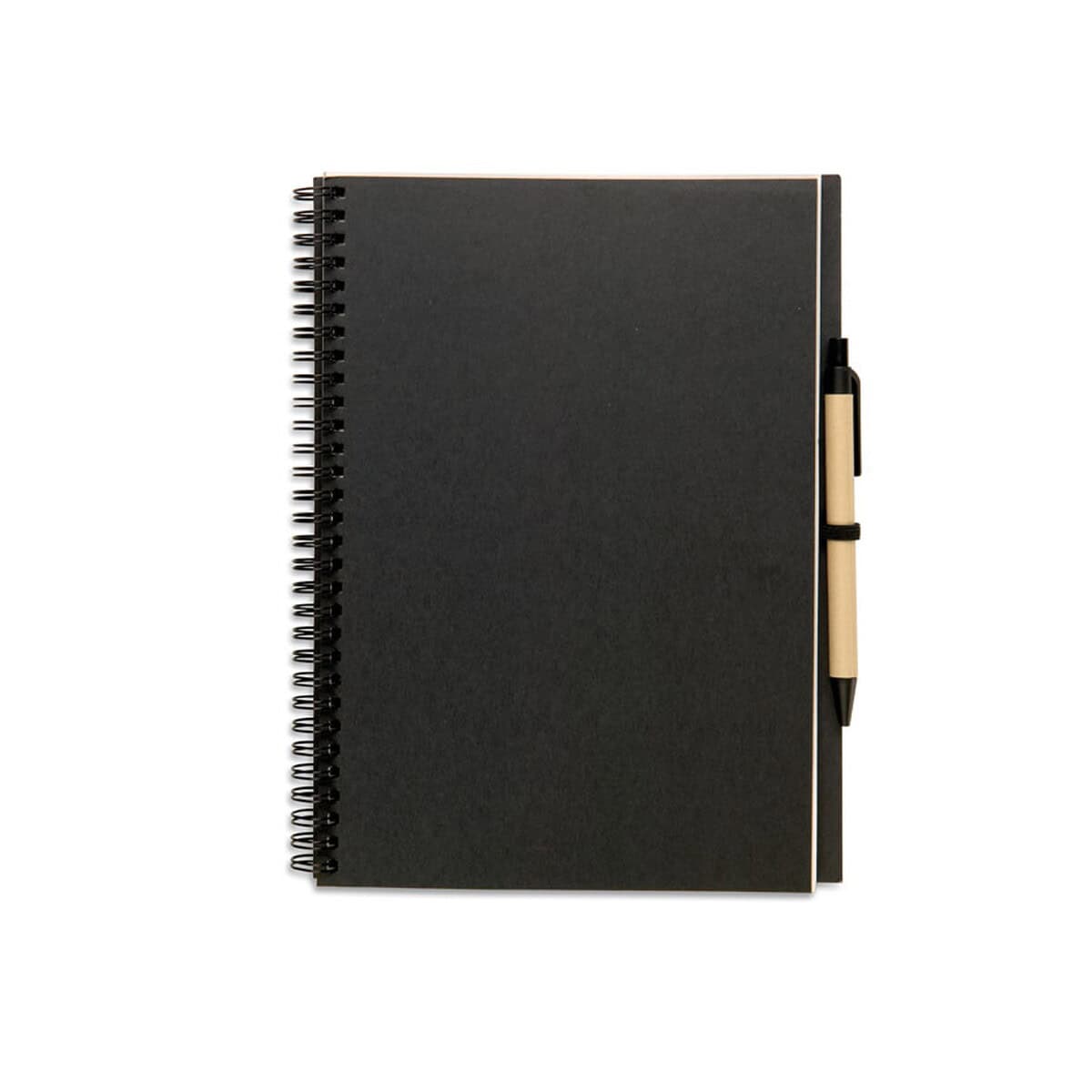 Notes z długopisem BLOQUERO PLUS to ekologiczny, a zarazem wyjątkowo praktyczny gadżet, który od pierwszego spojrzenia przyciąga czarną, elegancką okładką i subtelnym beżowym akcentem. Format 26 × 19 cm i lekka waga 0,310 kg sprawiają, że zmieści się w każdym plecaku czy torbie konferencyjnej. W środku czeka aż 140 czystych stron papieru z recyklingu, spiętych wytrzymałą podwójną spiralą, dzięki której notatki rozkładają się na płasko. Do kompletu dołączony jest przyciskany długopis z kartonu pochodzącego z recyklingu i biodegradowalnego plastiku, z niebieskim tuszem i czarnym, elastycznym uchwytem na długopis – wszystko po to, by każde zapisane słowo było wygodne i wygładzone 😊.