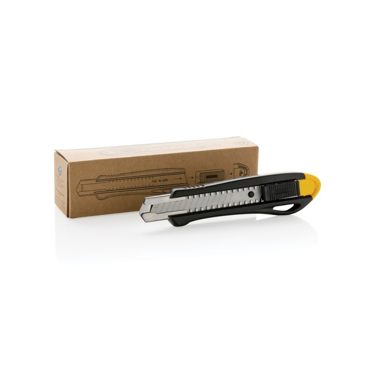 Cała konstrukcja noża została opracowana z myślą o minimalnym wpływie na środowisko – korpus noża stworzono z ABS z recyklingu, certyfikowanego przez RCS. Dodatkowo, opakowanie produktu tworzy papier kraftowy z certyfikatem FSC® mix, co podkreśla zaangażowanie marki w praktyki zrównoważone. Do noża dołączone są też dwie zapasy ostrzy, które również można łatwo wymieniać, zwiększając funkcjonalność narzędzia.