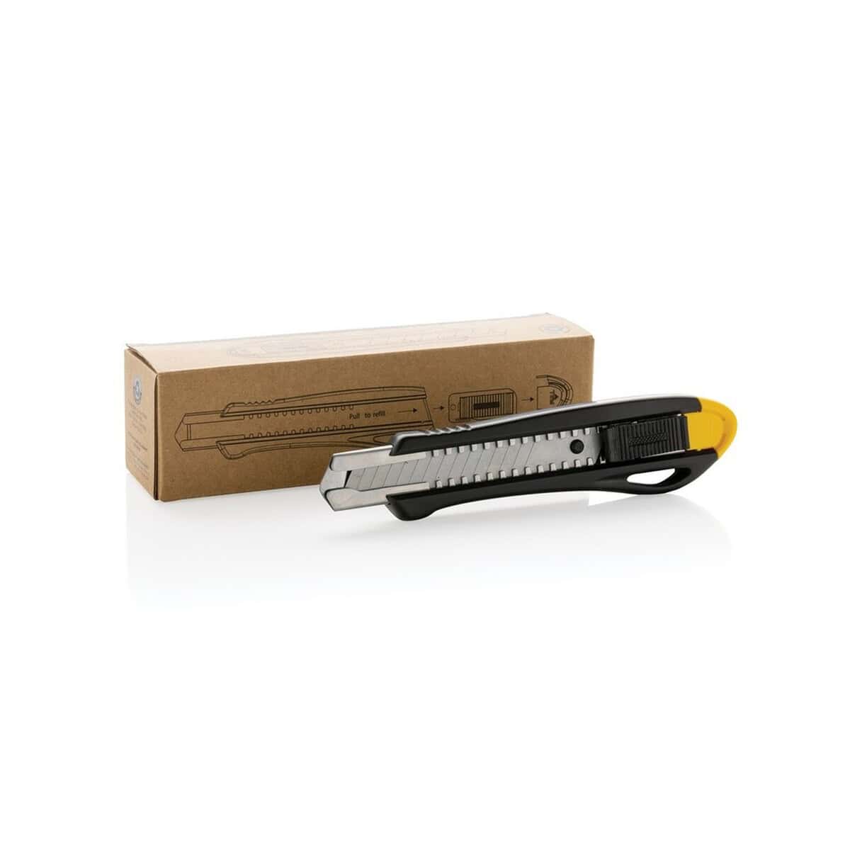 Elegancka, kontrastowa kolorystyka – szary korpus i żółty suwak – oraz miejsce na wyraźne logo i trwały nadruk sprawiają, że Nóż do tapet staje się praktyczną wizytówką dla Twojej firmy. Niski ślad węglowy 0,5 kg CO₂ oraz opakowanie z papieru kraftowego z certyfikatem FSC® podkreślają proekologiczny charakter produktu, co docenią marki z branży budowlanej, remontowej, logistycznej, e-commerce, a także organizacje propagujące zrównoważony styl życia.